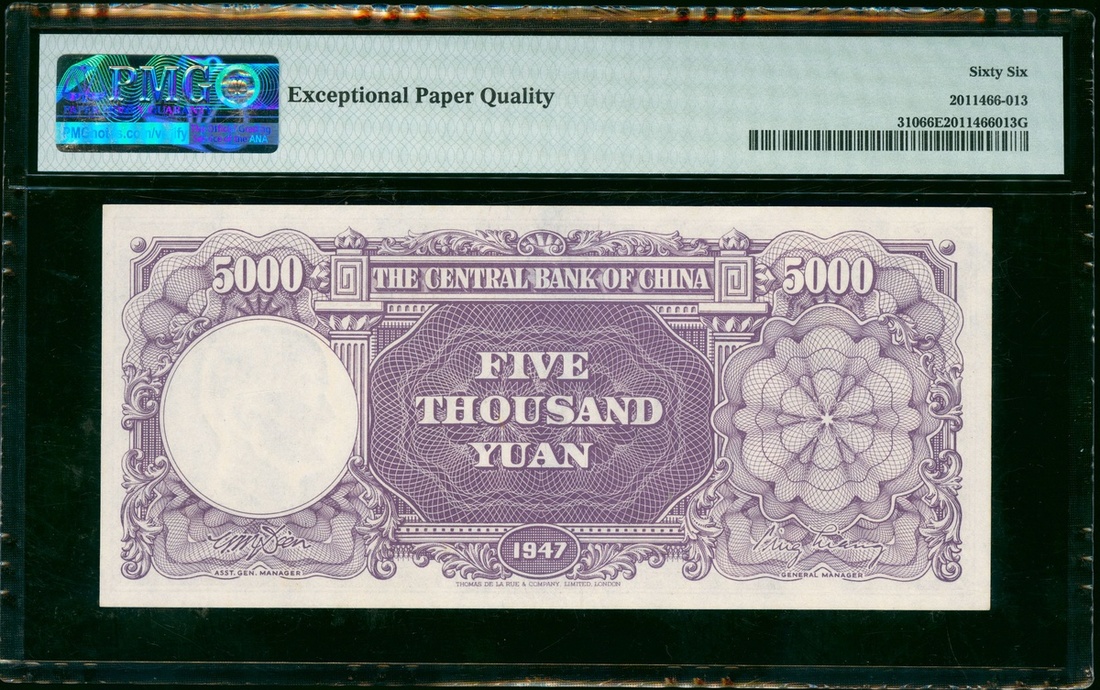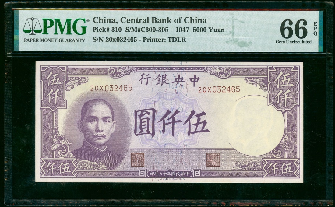 Bank of Communications, 5000 yuan, Year 36 (1947), serial number 20x 032465, (Pick 310), PMG 66EPQ Gem Uncirculated.