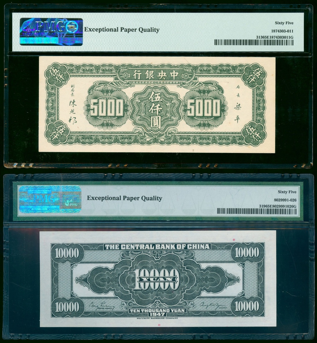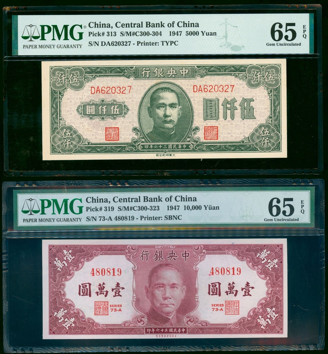 The Central Bank of China, a pair of 5000 yuan and 10000 yuan, Year 36 (1947), serial numbers DA620327 and 480819, (Pick 313 and 319), both graded PMG 65EPQ Gem Uncircluated (2).