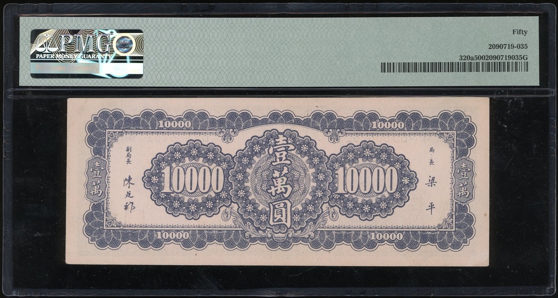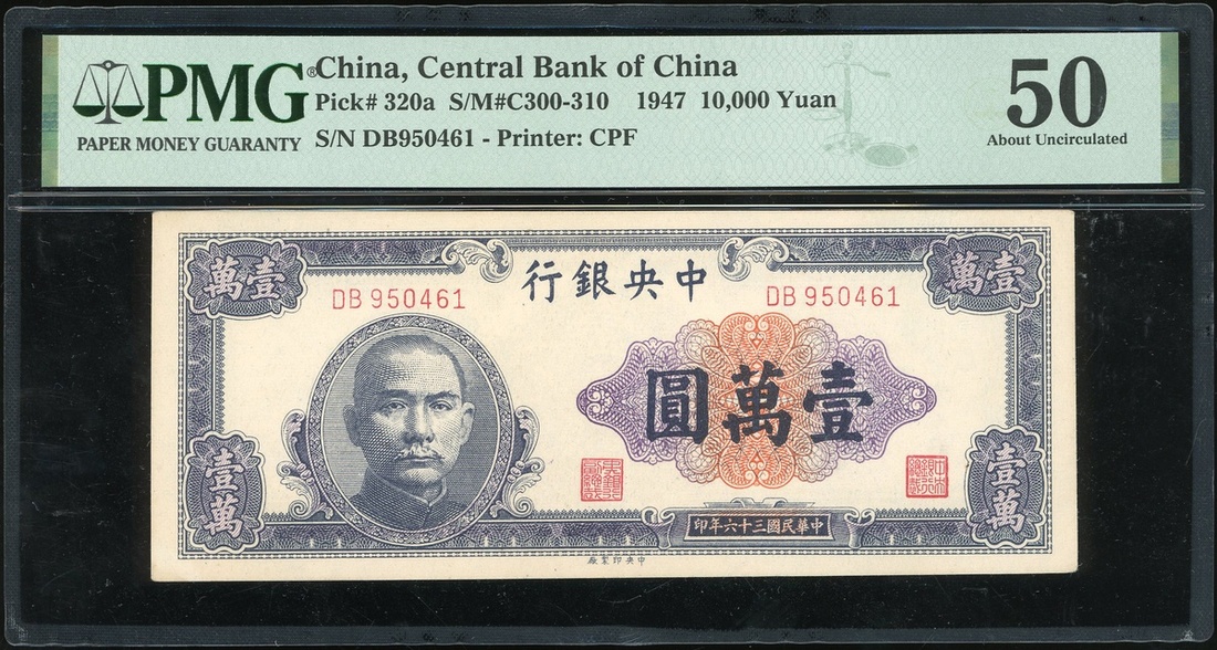 民國三十六年(1947)中央銀行壹萬圓,編號DB950461,中央印刷廠印製,PMG 50