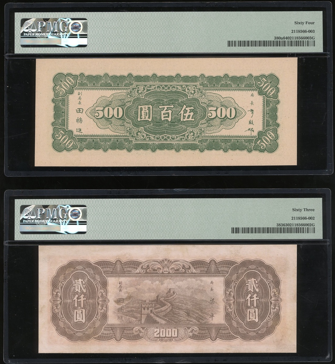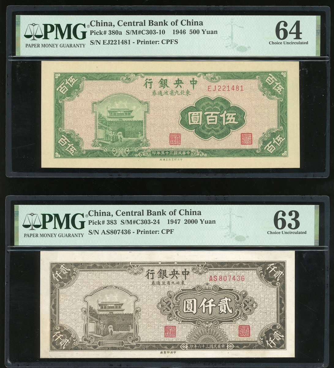 The Central Bank of China, a trio of notes for circulation in the Nine Northeastern Provinces, 500 yuan, 2000 yuan and 2000 yuan, Year 35, 36 and 37 (1946, 1947 and 1948), serial numbers EJ221481, AS807436, AE850034,