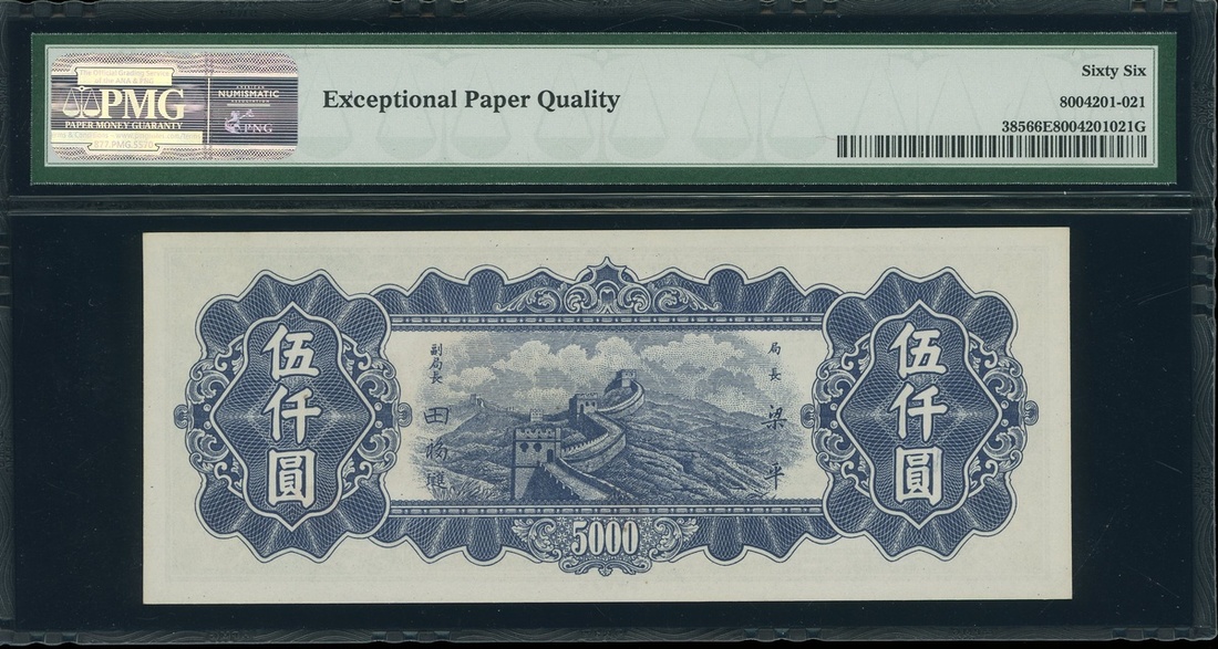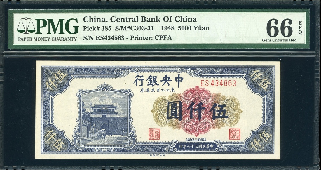民國三十七年(1948)中央銀行東北九省流通券伍仟圓,編號ES434863,評PMG 66EPQ