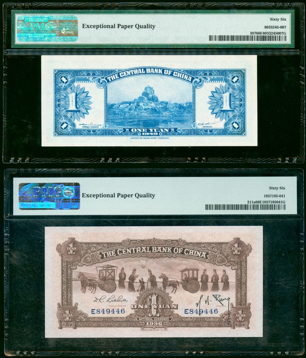 The Central Bank of China, group of 2, consists of 1 yuan, Year 34 (1945), serial number SW586046, and 1 yuan, Year 25 (1936), serial number E849446, (Pick 387, 211a), both graded PMG 66EPQ Gem Uncirculated (2)