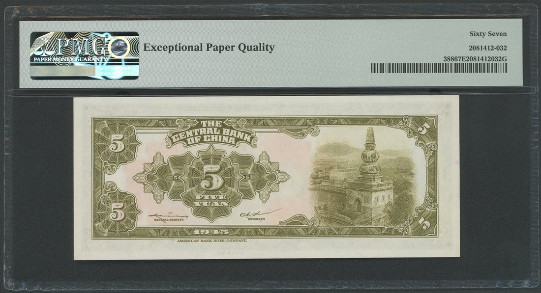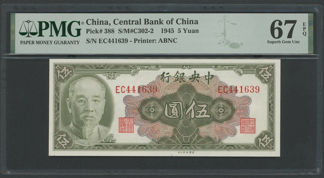The Central Bank of China, 5 yuan, 1945, serial number EC441639, (Pick 388), PMG 67EPQ Superb Gem Uncirculated