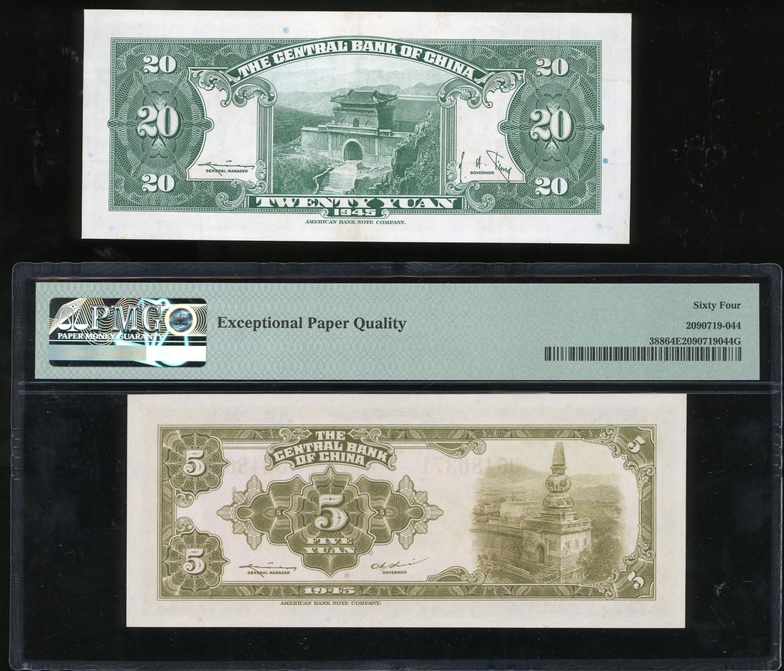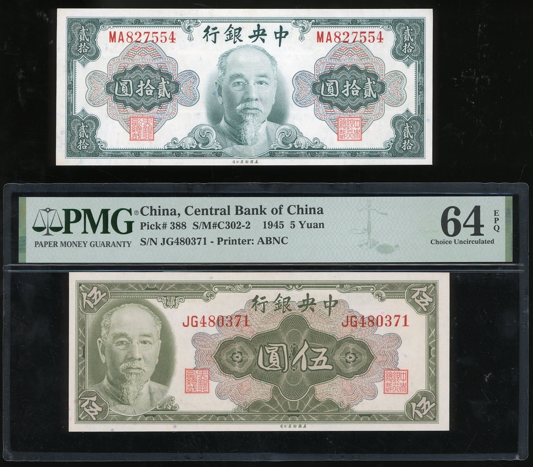 (Pick 388 and 391), 5 yuan graded PMG 64EPQ and 20 yuan almost uncirculated (2).