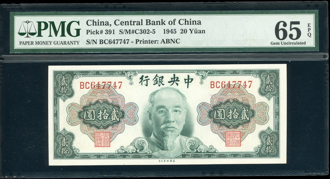 Central Bank of China, 20 yuan, 1945, serial number BC647747, (Pick 391), PMG 65EPQ Gem Uncirculated