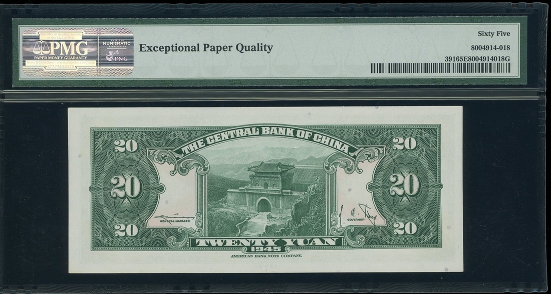 民國三十四年(1945)中央銀行貳拾圓,編號BC647747,PMG 65EPQ