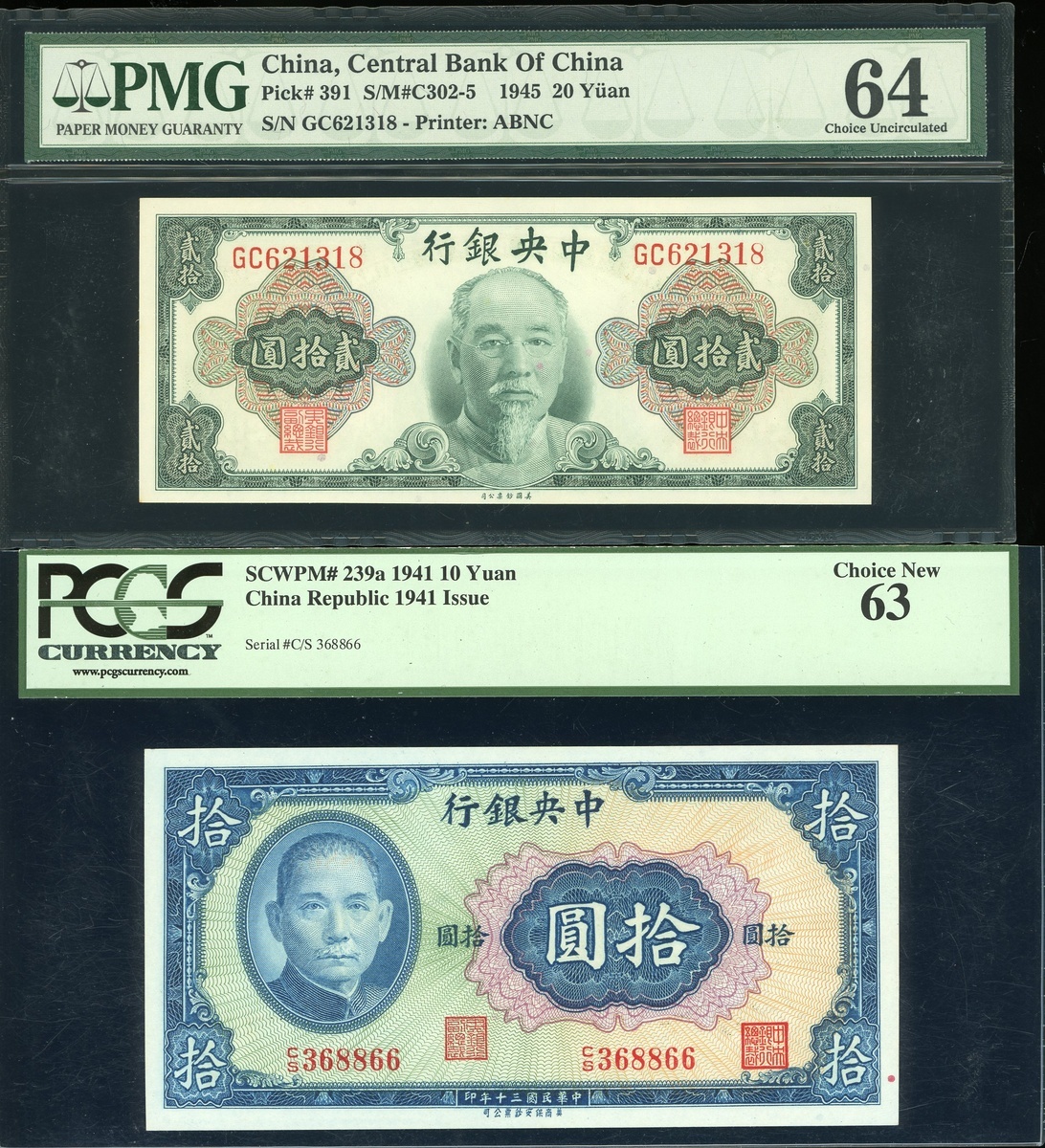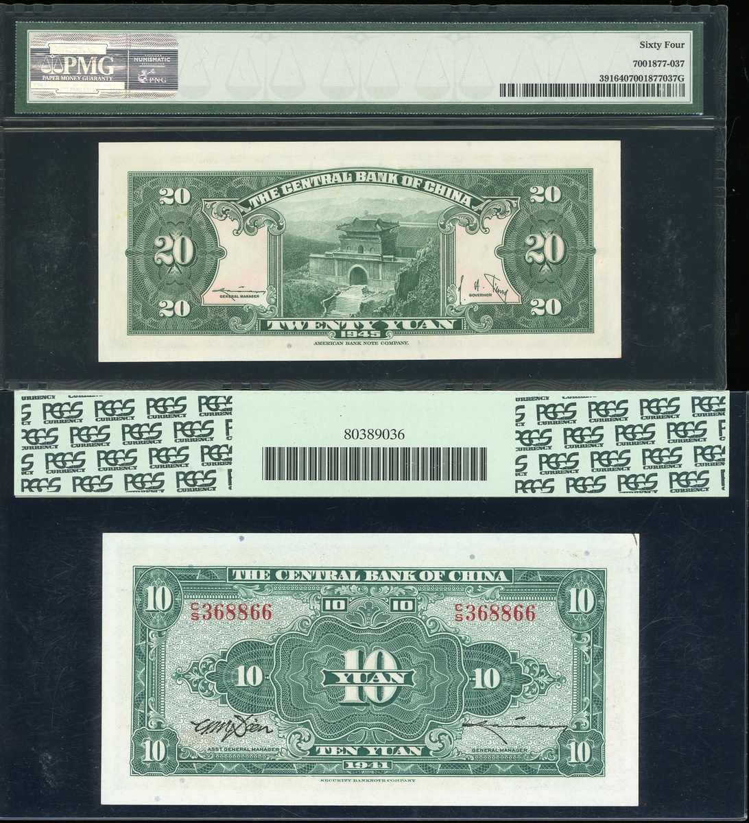 中央銀行鈔票一對,民國三十年(1941)拾圓及民國三十四年(1945)貳拾圓,編號CS368866及GC621318,分別評PCGS Currency 63及PMG 64
