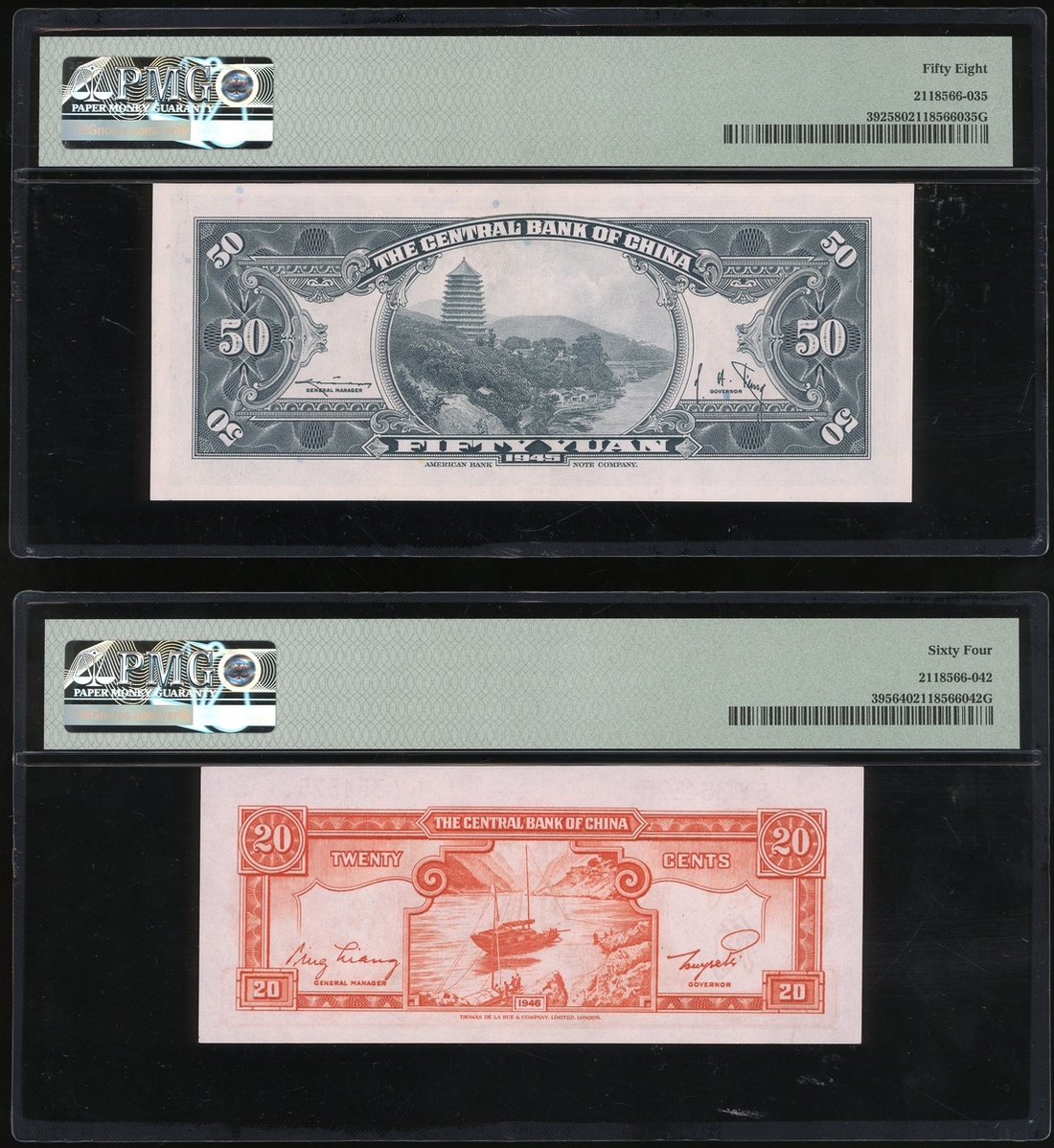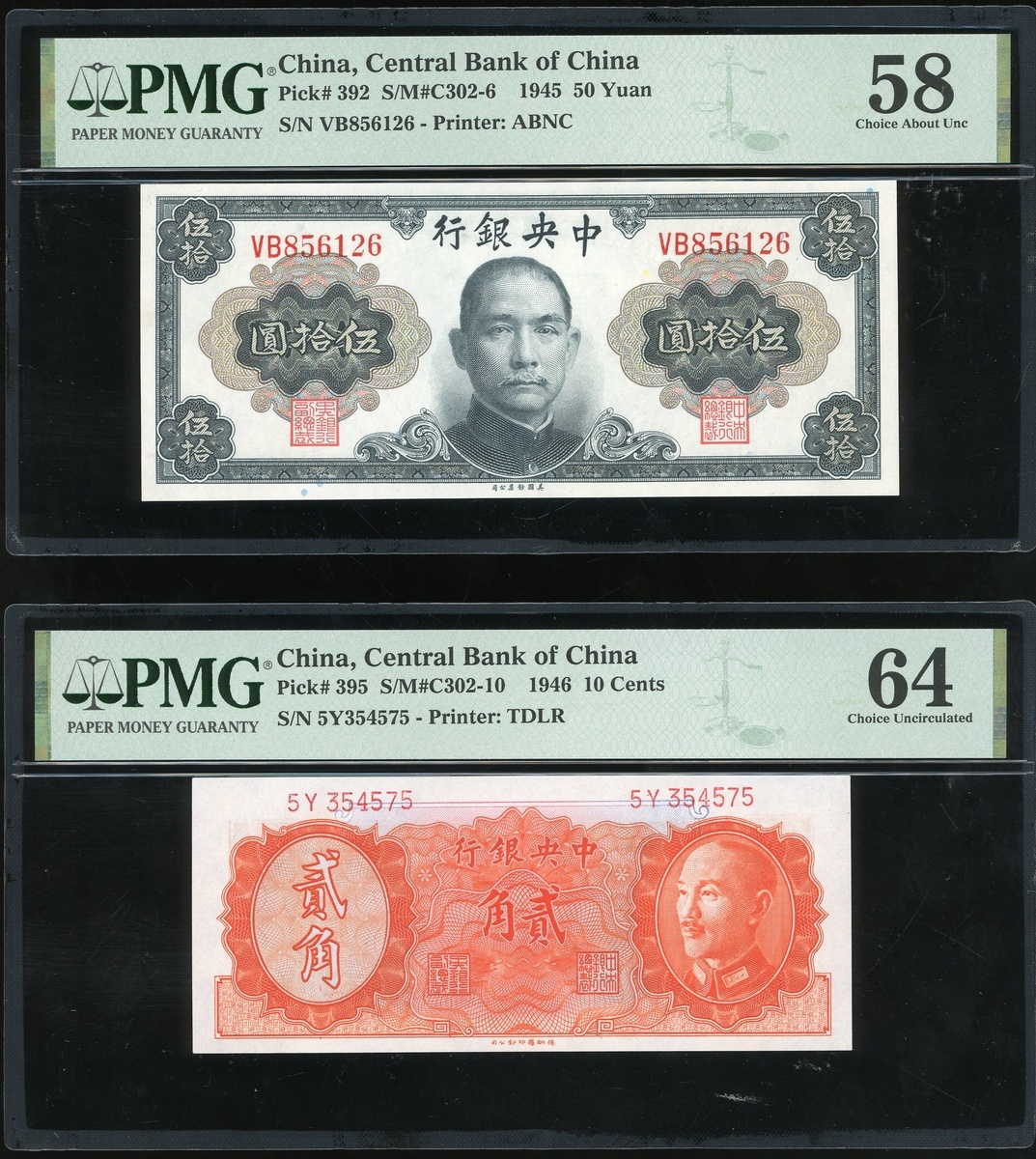 中央銀行鈔票一對,民國三十四年(1945)伍拾圓及民國三十五年(1946)壹角,編號VB856126, 5Y354575,,分別評PMG 58 及64