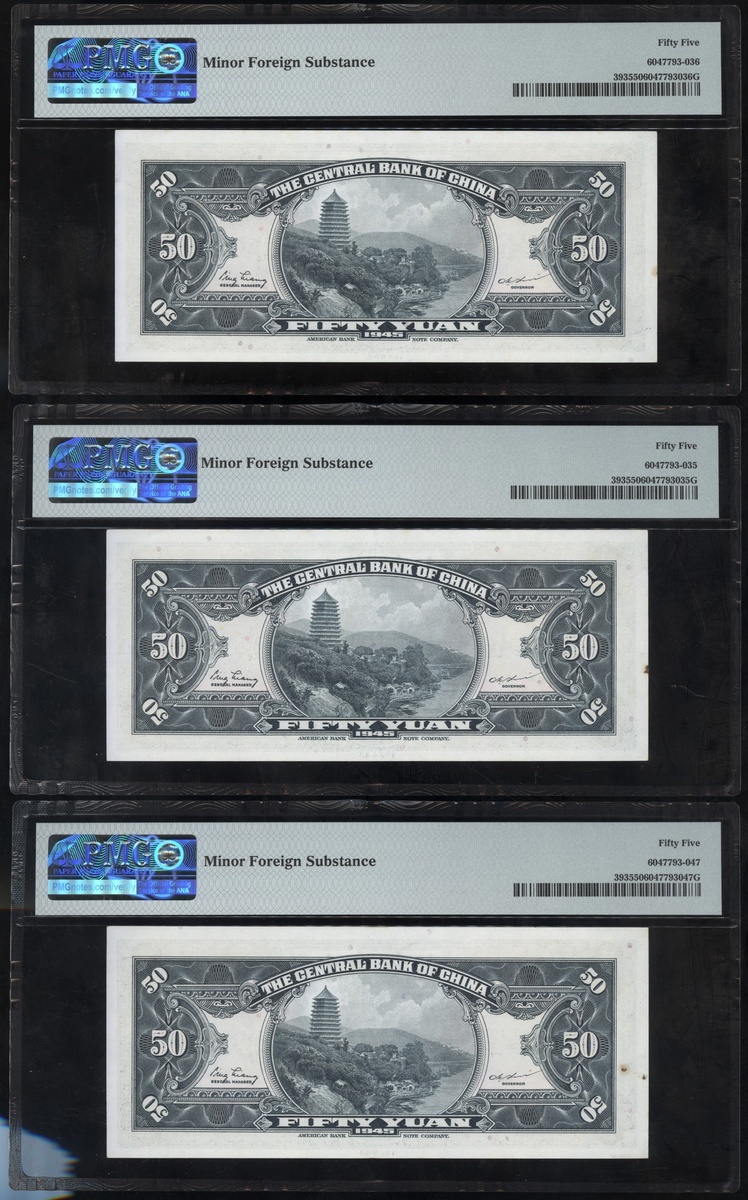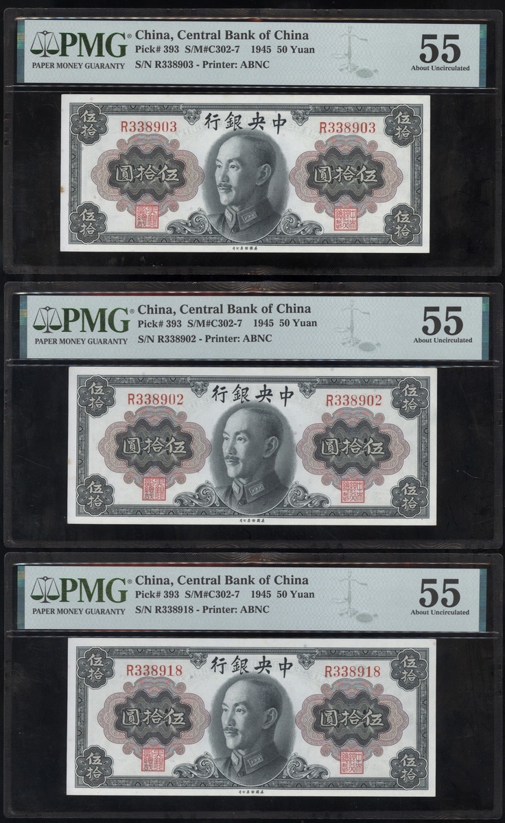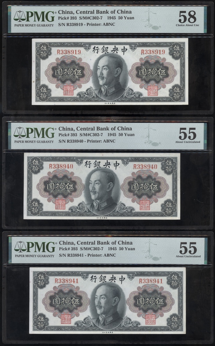 Central Bank of China, (Pick 393), one graded PMG 58 Choice About Uncirculated, the rest 55 About Uncirculated (6)