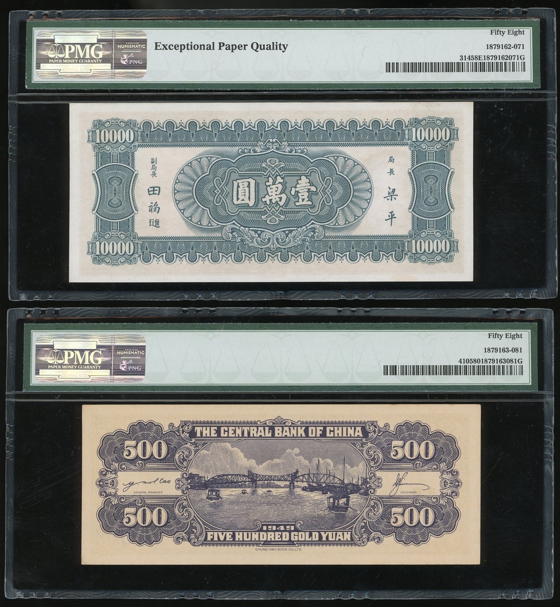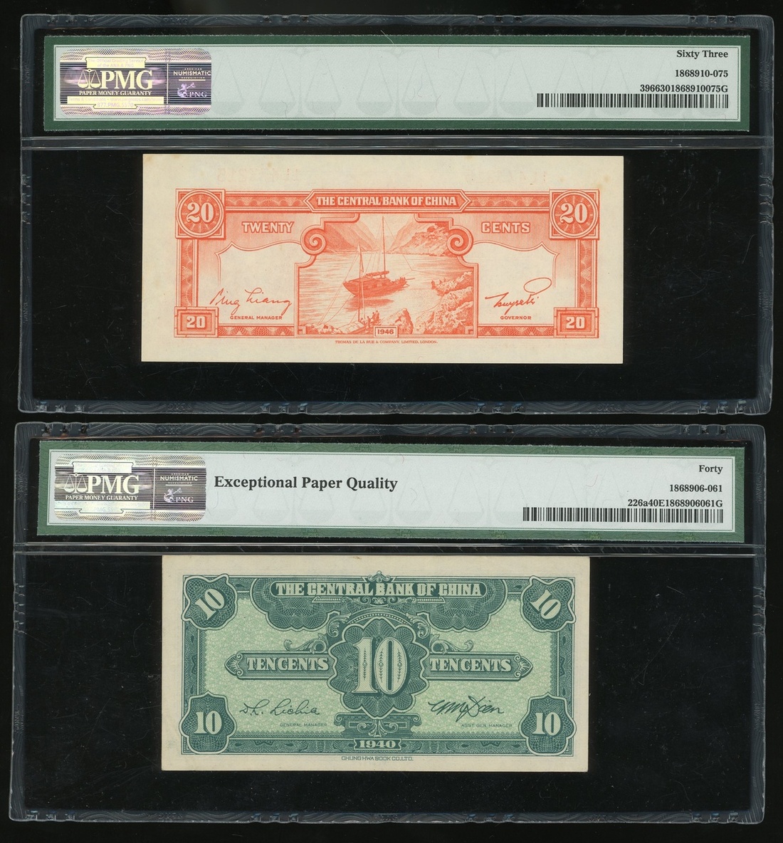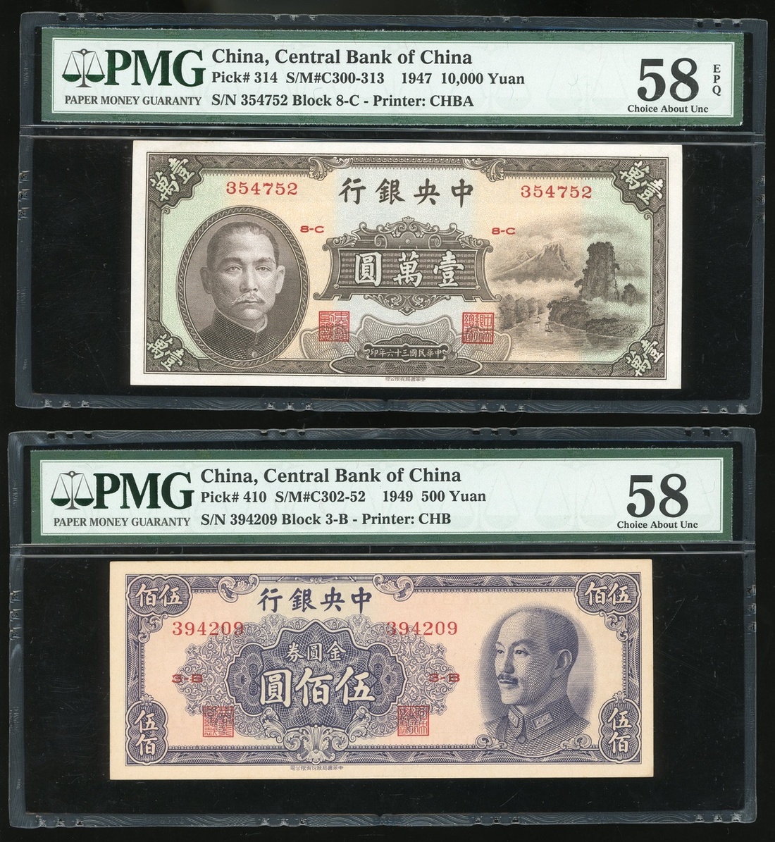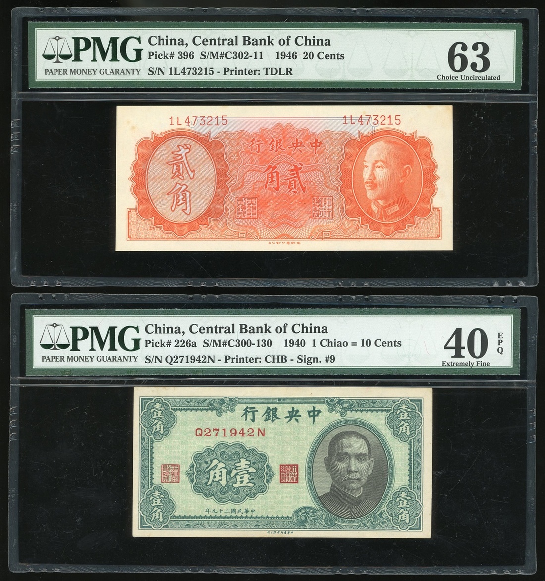 Central Bank of China, a group of 4 notes, consist of 10 cents, 20 cents, 500 and 10,000 Yuan, 1949 and 1947, serial numbers SK413535, B/Z089451, 394209 and 354752, (Pick 410, 314), graded PMG 40EPQ, 63, 58EPQ and 58 respectively (4)
