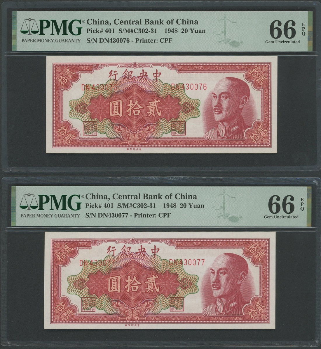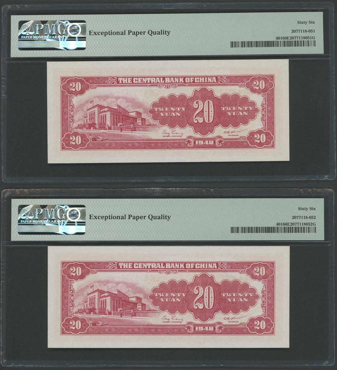 The Central Bank of China, 20 yuan, 1948, consecutive serial numbers DN430076, DN430077, (Pick 401), both graded PMG 66EPQ Gem Uncirculated (2)