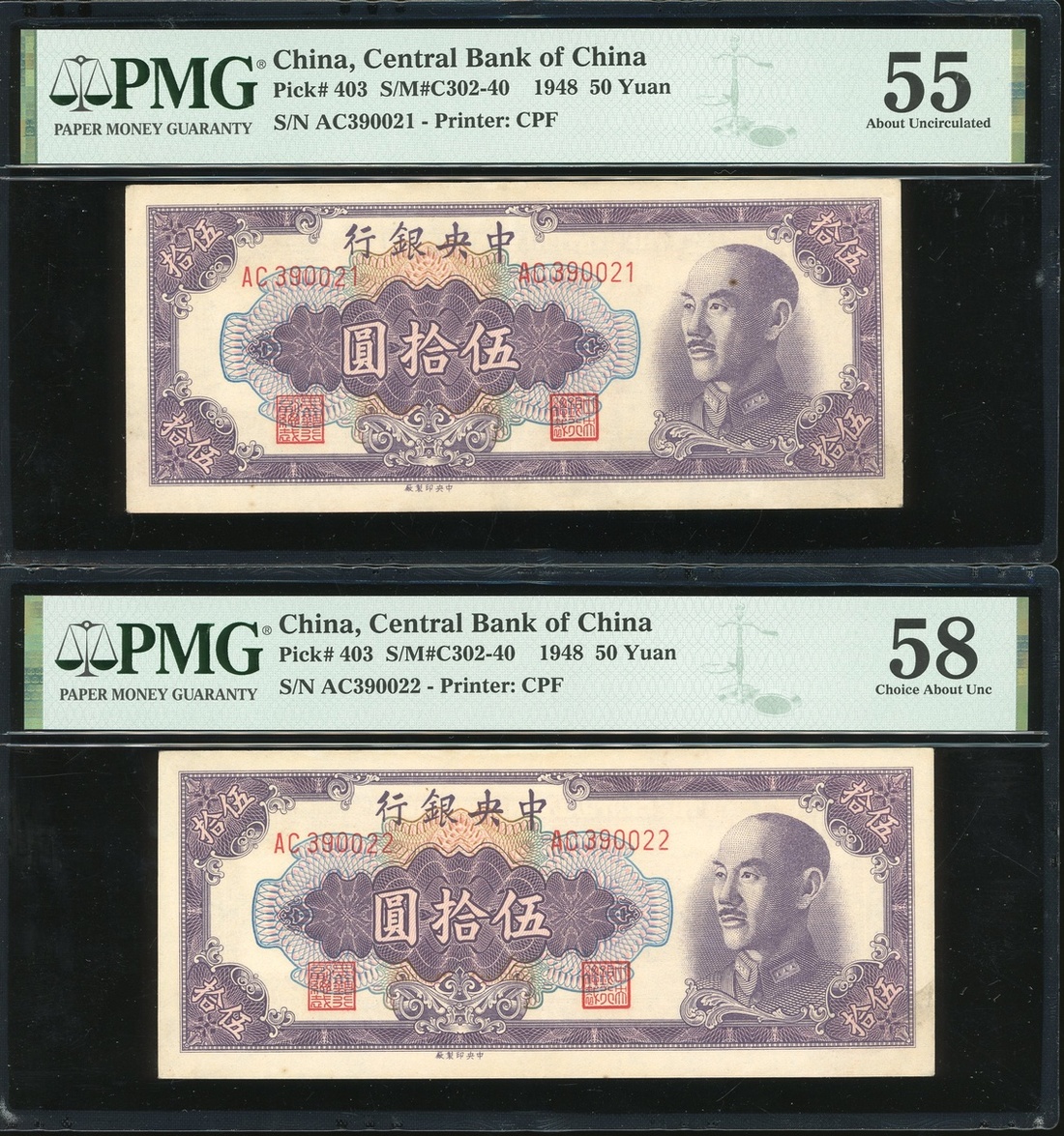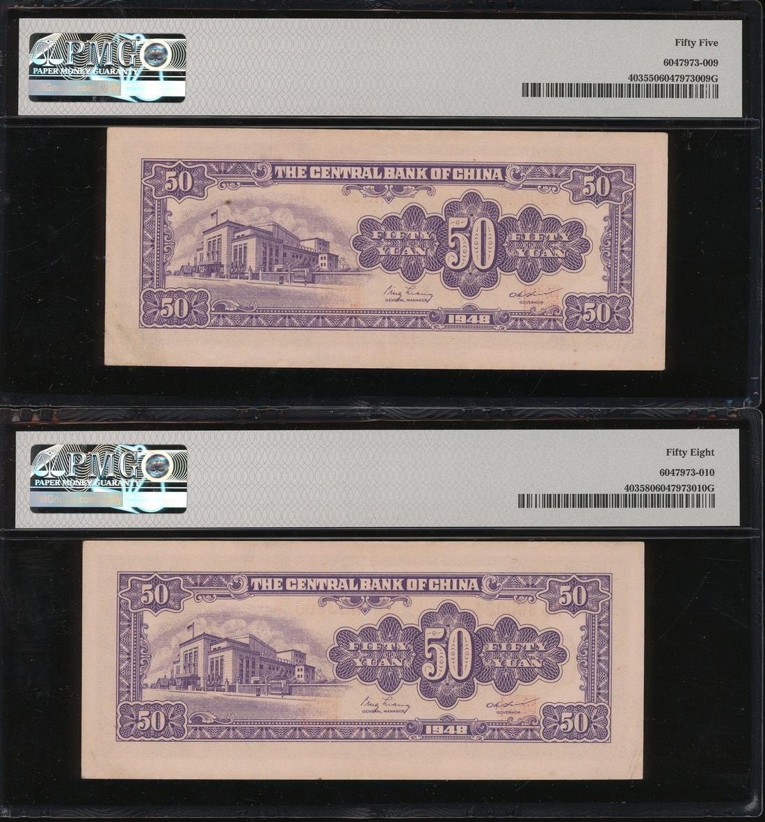 民國三十七年(1948)中央銀行伍拾圓一對,編號SC390021-2,評PMG 55及PMG 58