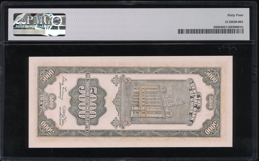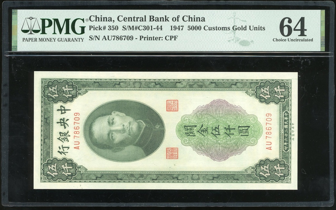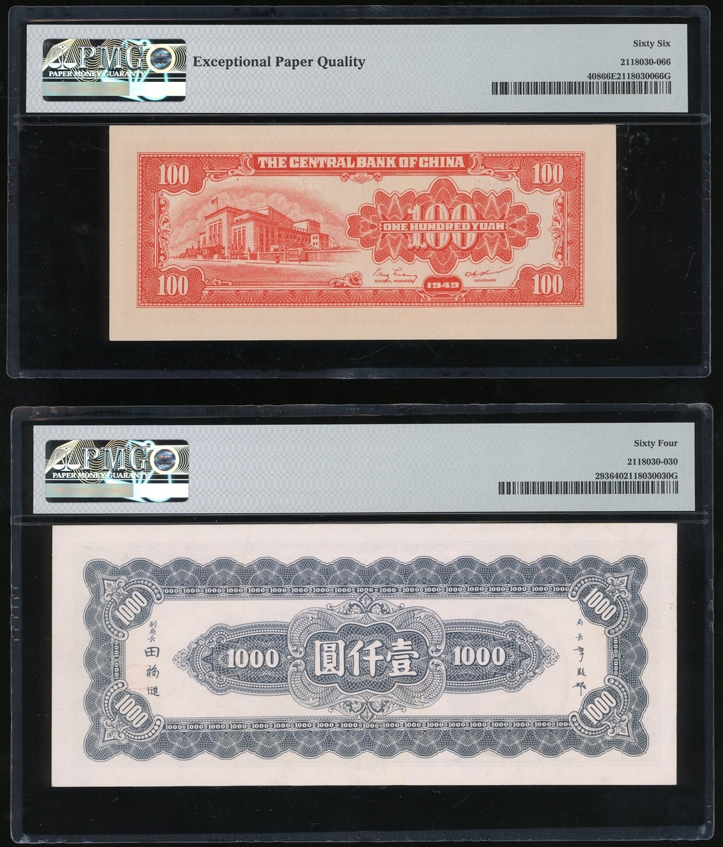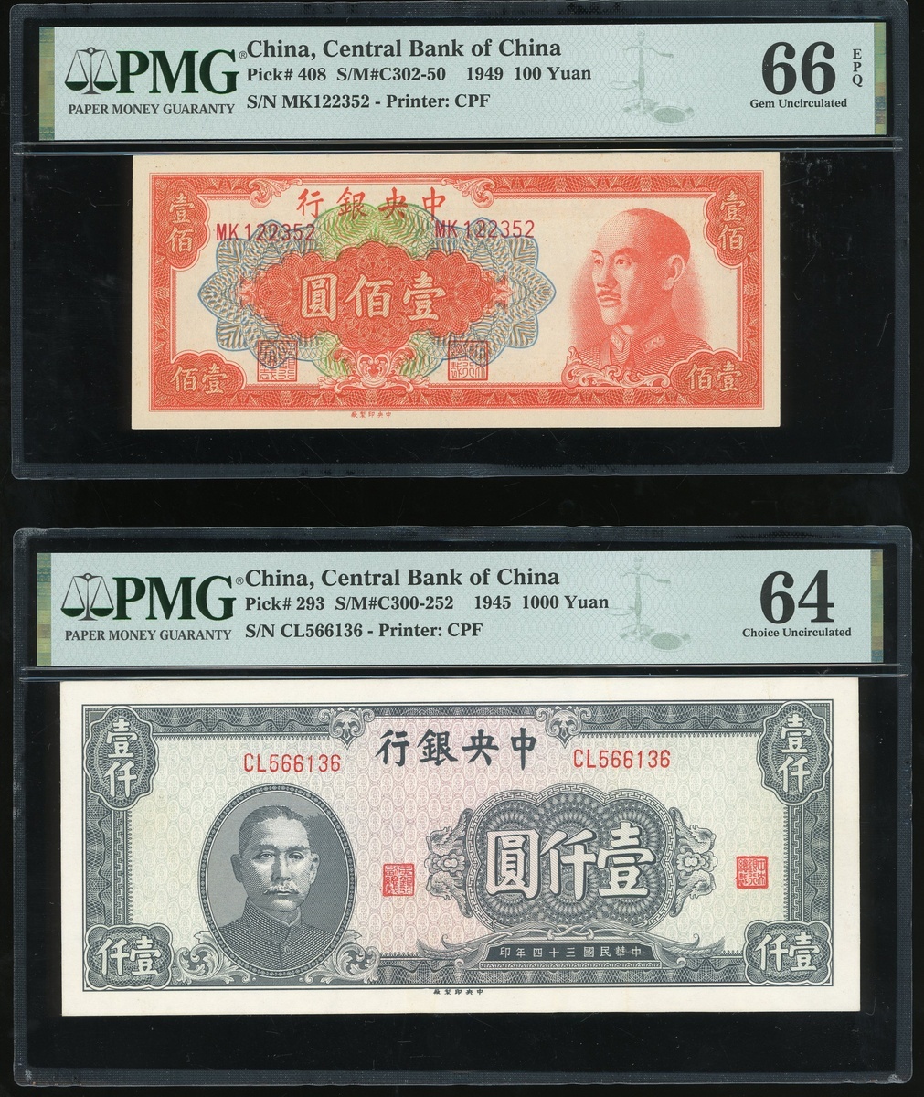 The Central Bank of China, group of 3, consisting of: 100 yuan, 1949, serial number MK122352, 1000 yuan, Year 34 (1945), serial number CL566136, 5000 Custom Gold Units, Year 36 (1947), serial number AU786709, (Pick 408, 293, 350), graded PMG 66EPQ, 64 and 64 respectively (3)