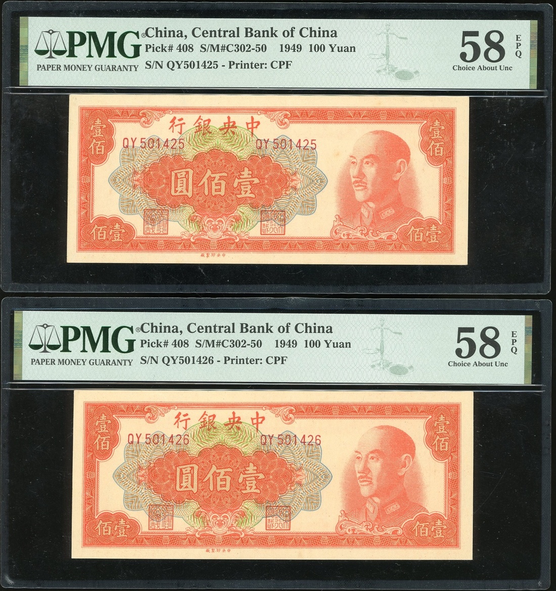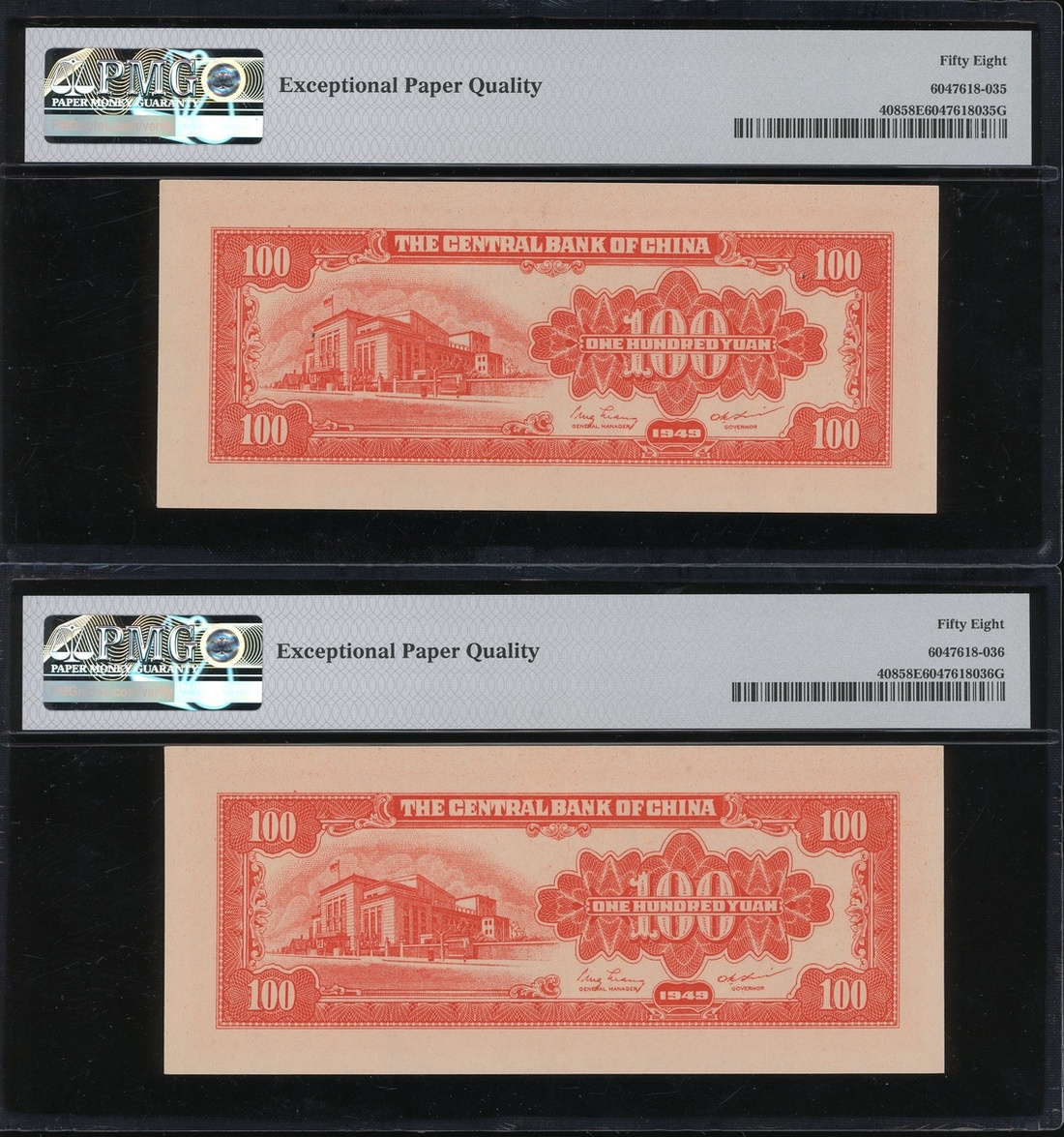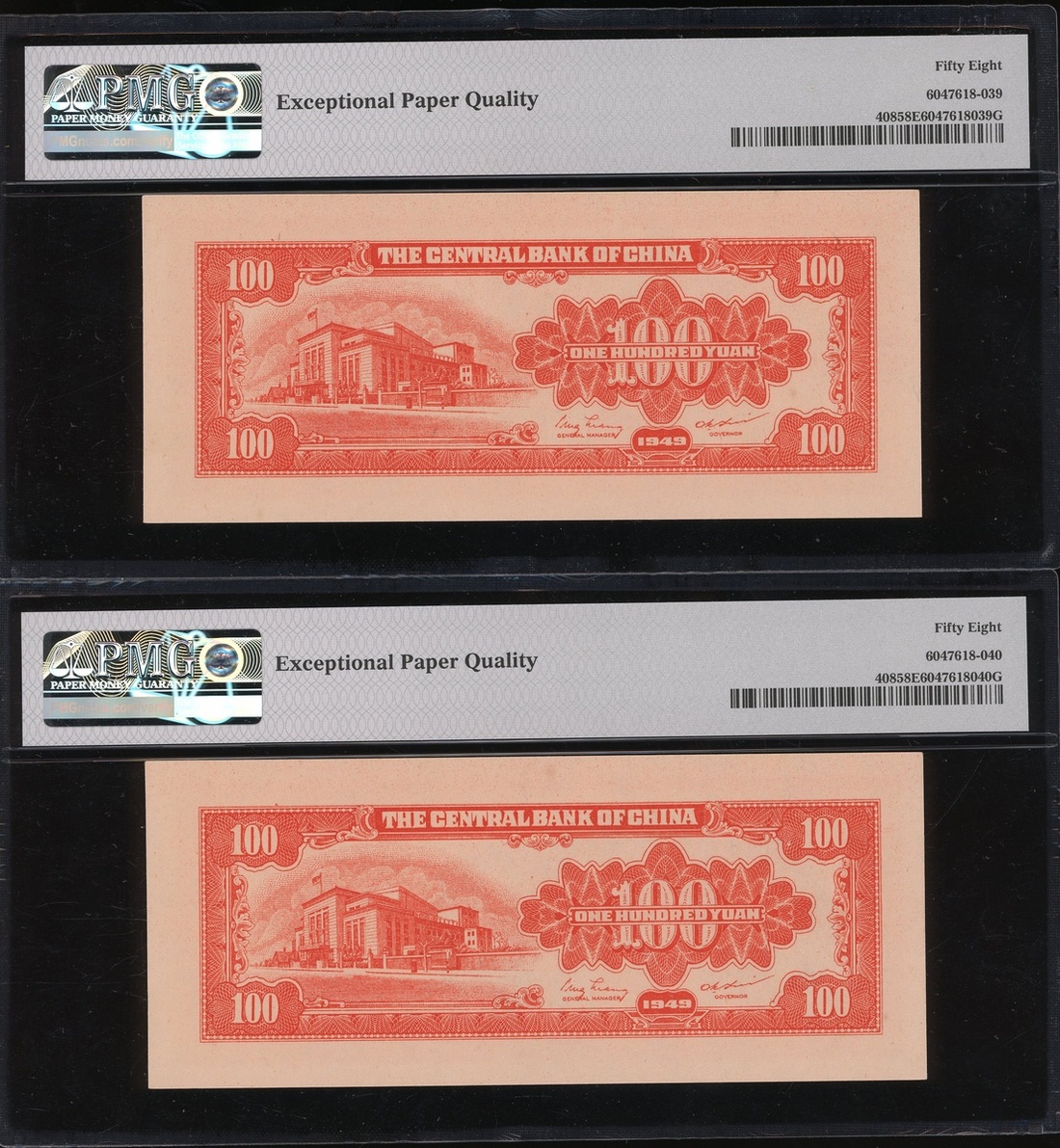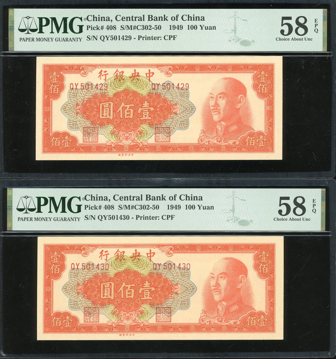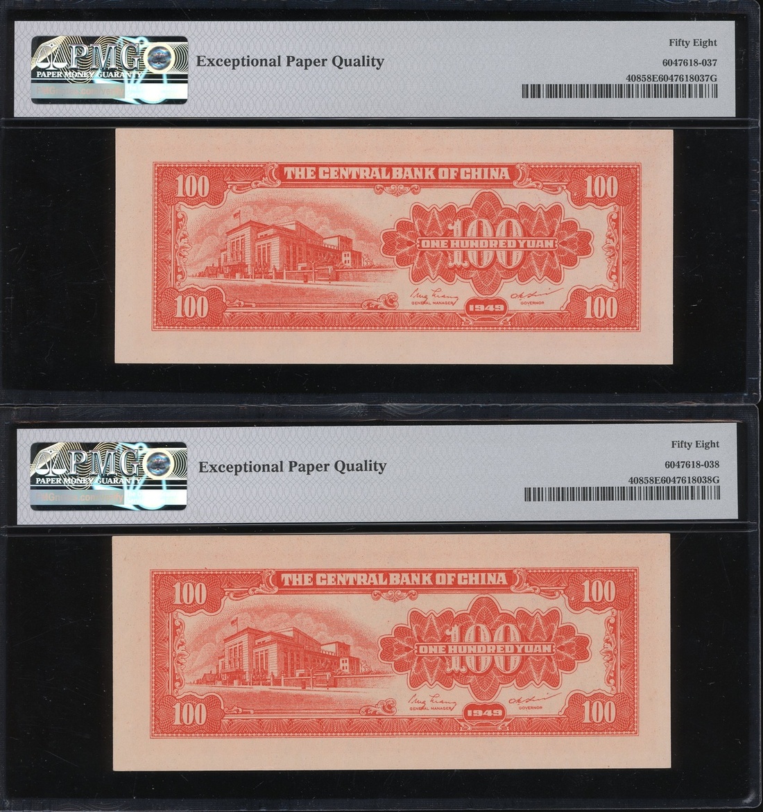 Central Bank of China, a group of 14X 100 yuan, 1949, consists of several consecutive groups, QY 501425-32, 434-436, 438-439 and 459, (Pick 408), graded PMG 58EPQ-64EPQ (14).