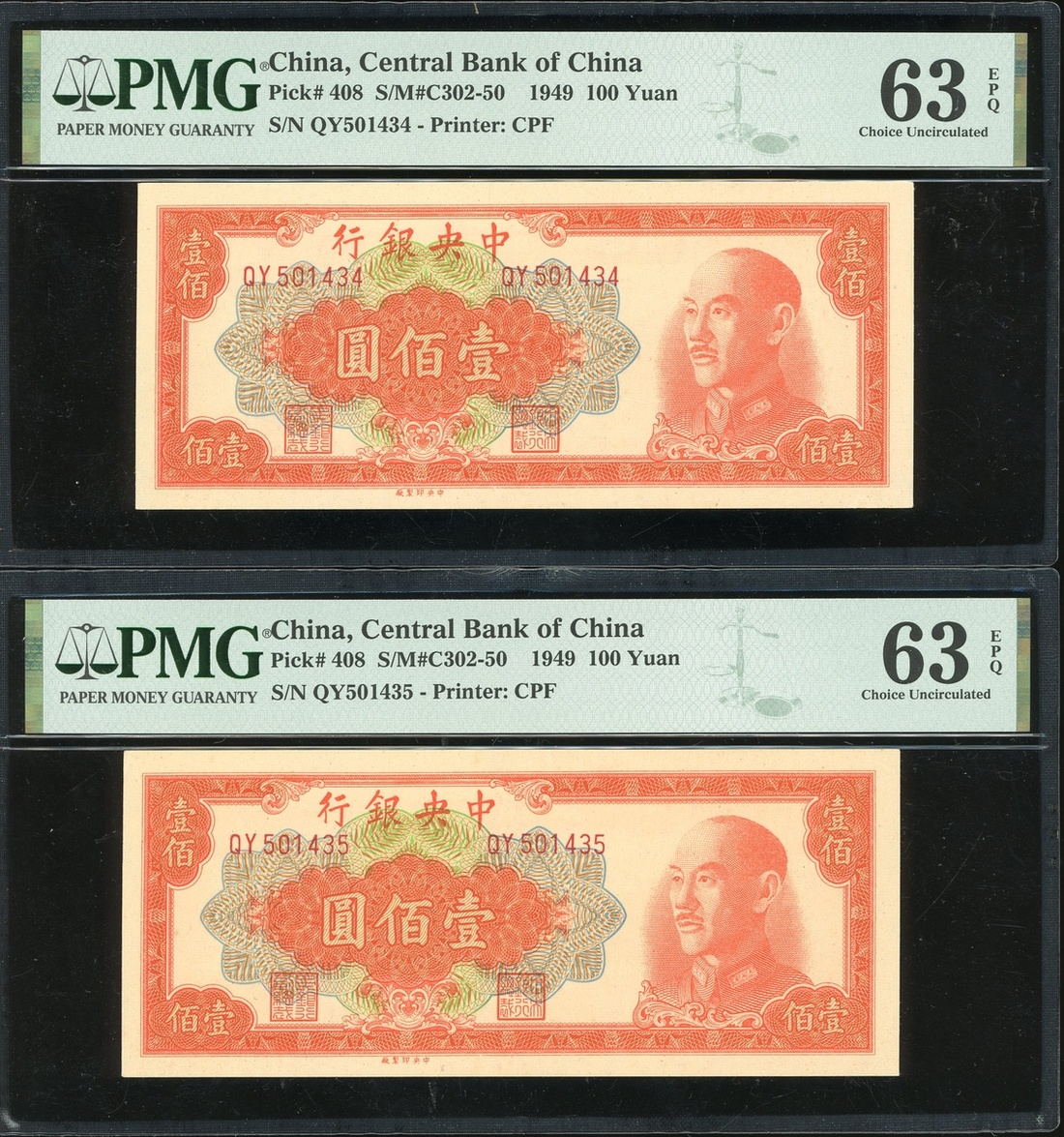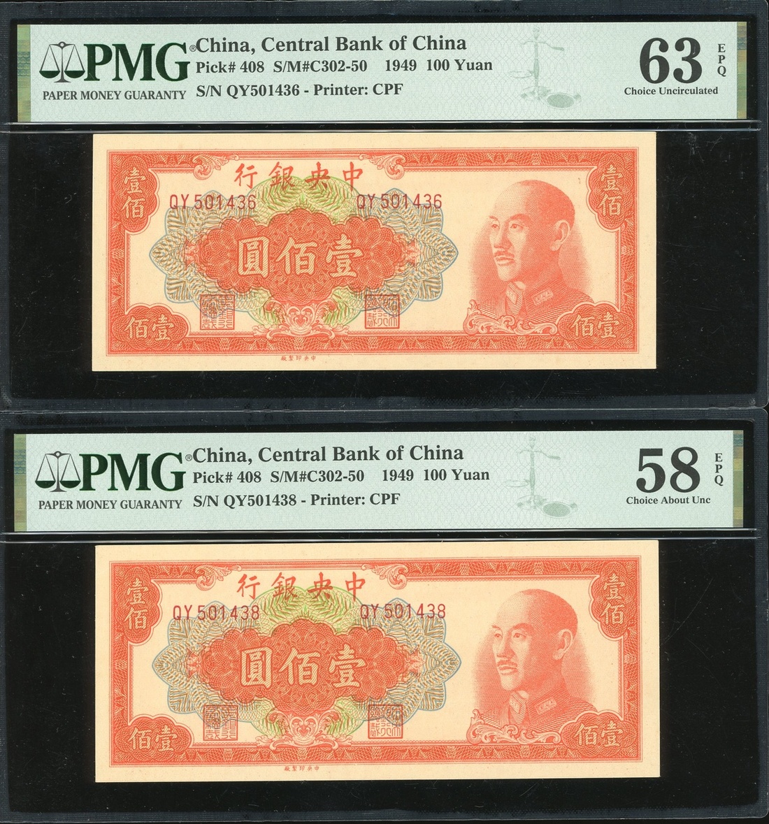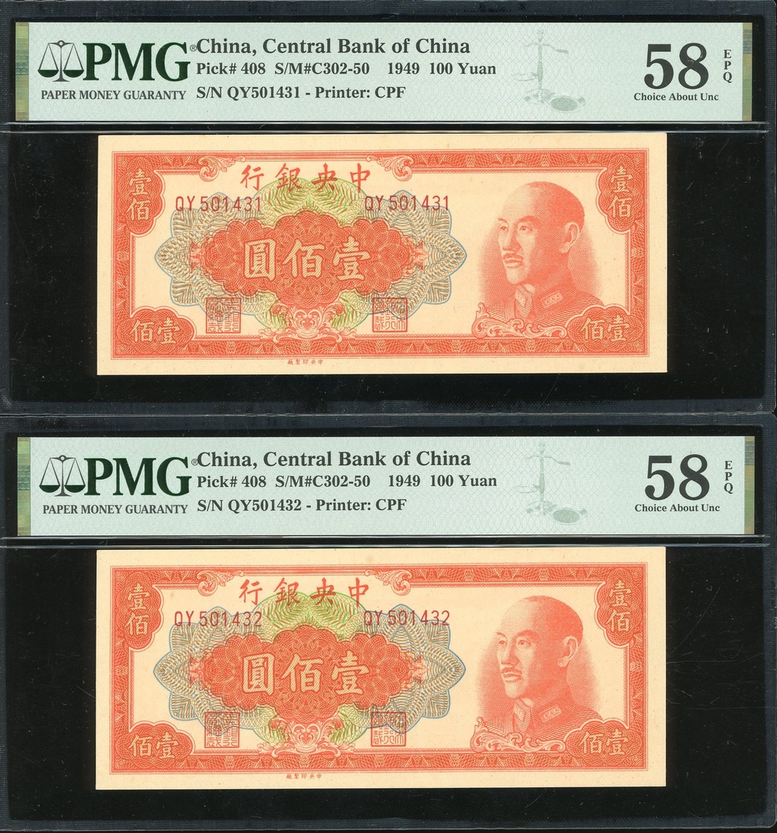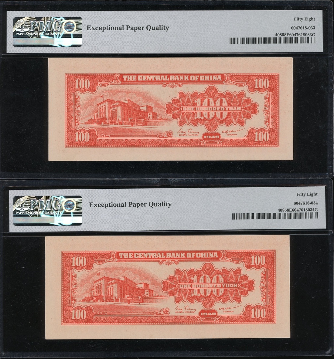 Central Bank of China, a group of 14X 100 yuan, 1949, consists of several consecutive groups, QY 501425-32, 434-436, 438-439 and 459, (Pick 408), graded PMG 58EPQ-64EPQ (14).