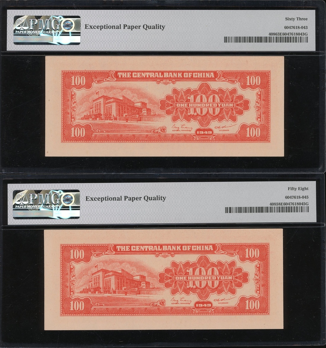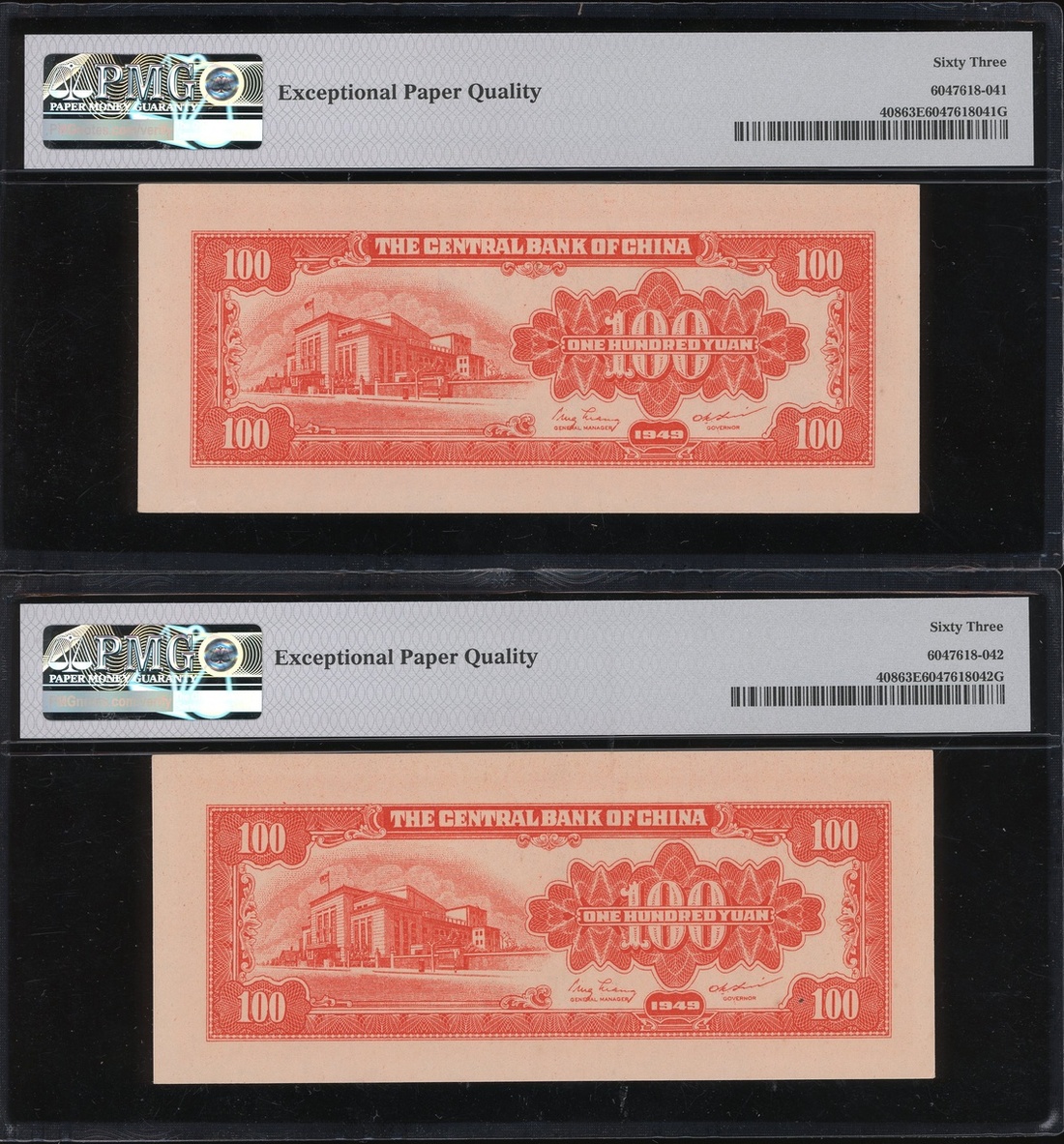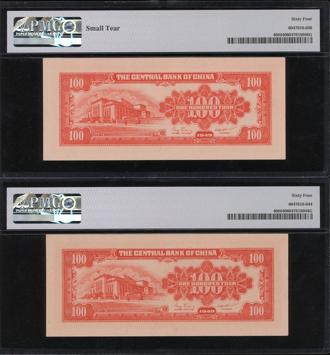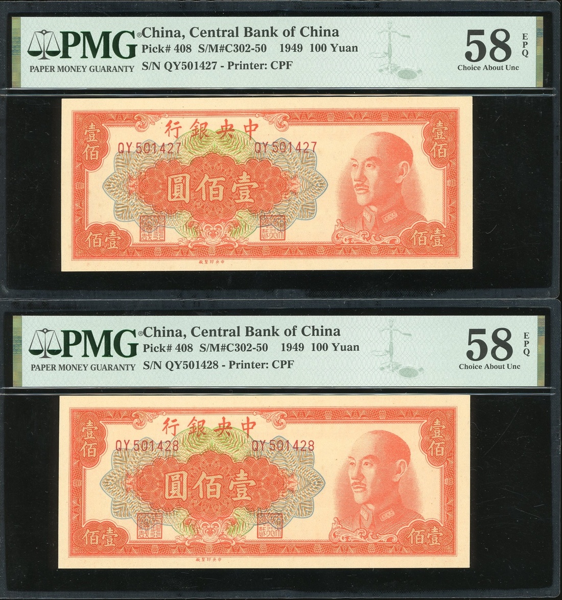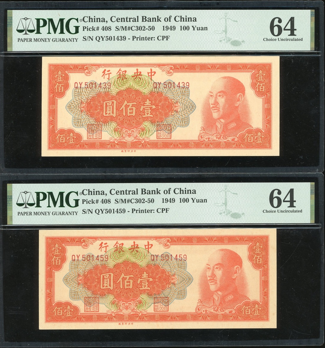 Central Bank of China, a group of 14X 100 yuan, 1949, consists of several consecutive groups, QY 501425-32, 434-436, 438-439 and 459, (Pick 408), graded PMG 58EPQ-64EPQ (14).