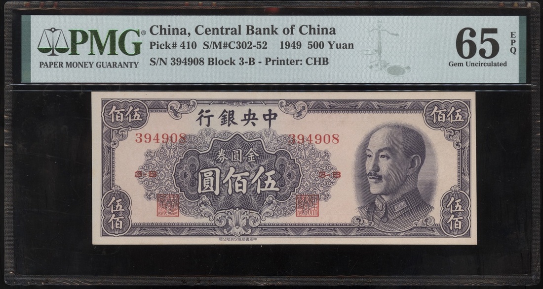 民國三十八年中央銀行金圓券伍佰圓,編號394308,PMG 65EPQ