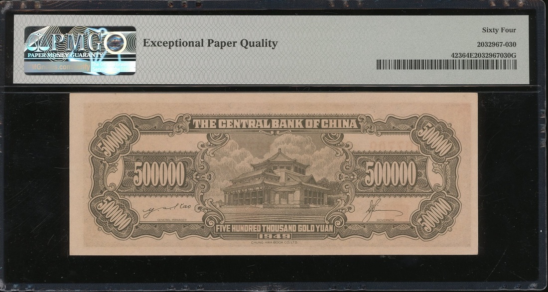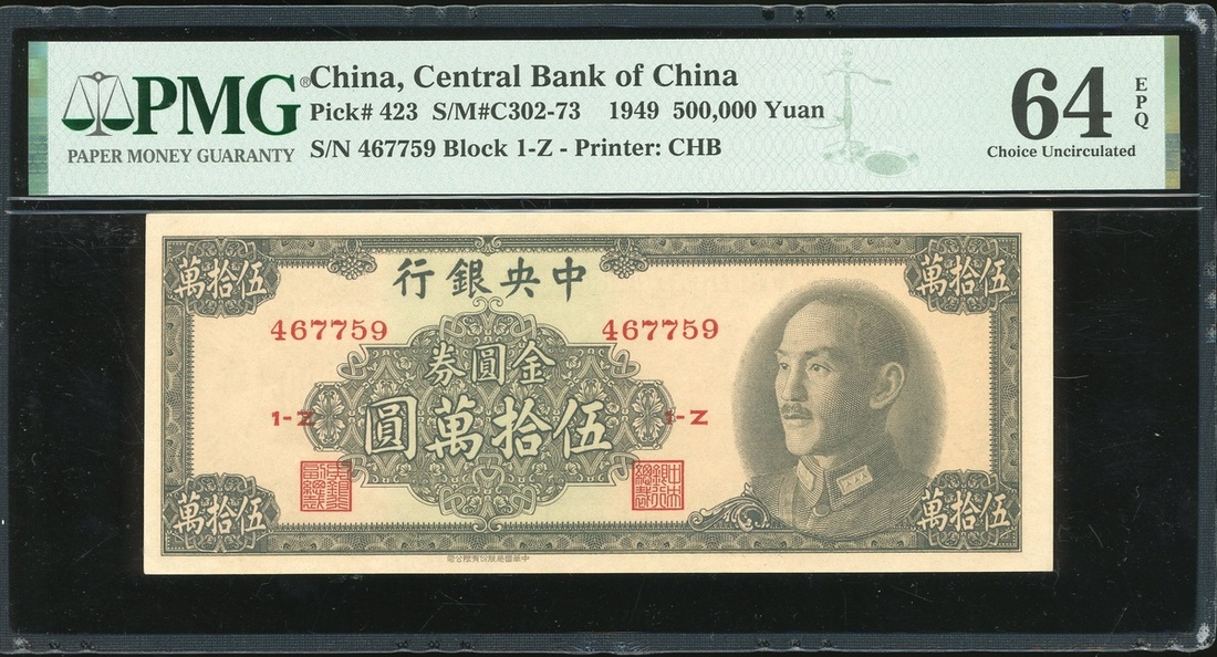 民國三十八年(1949)中央銀行伍拾萬金元券,編號467759,評PMG 64EPQ