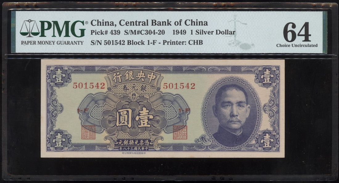 a group of 3 notes, consists of 1 Silver Dollar, 1949, and a pair of 5 Silver Dollars, Chungking and Canton, serial number 501542, 690380 and 082014,