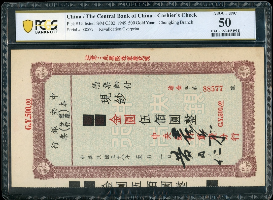民國三十八年中央銀行五百金元支票,重慶分行,編號88577,PCGS Banknote 50