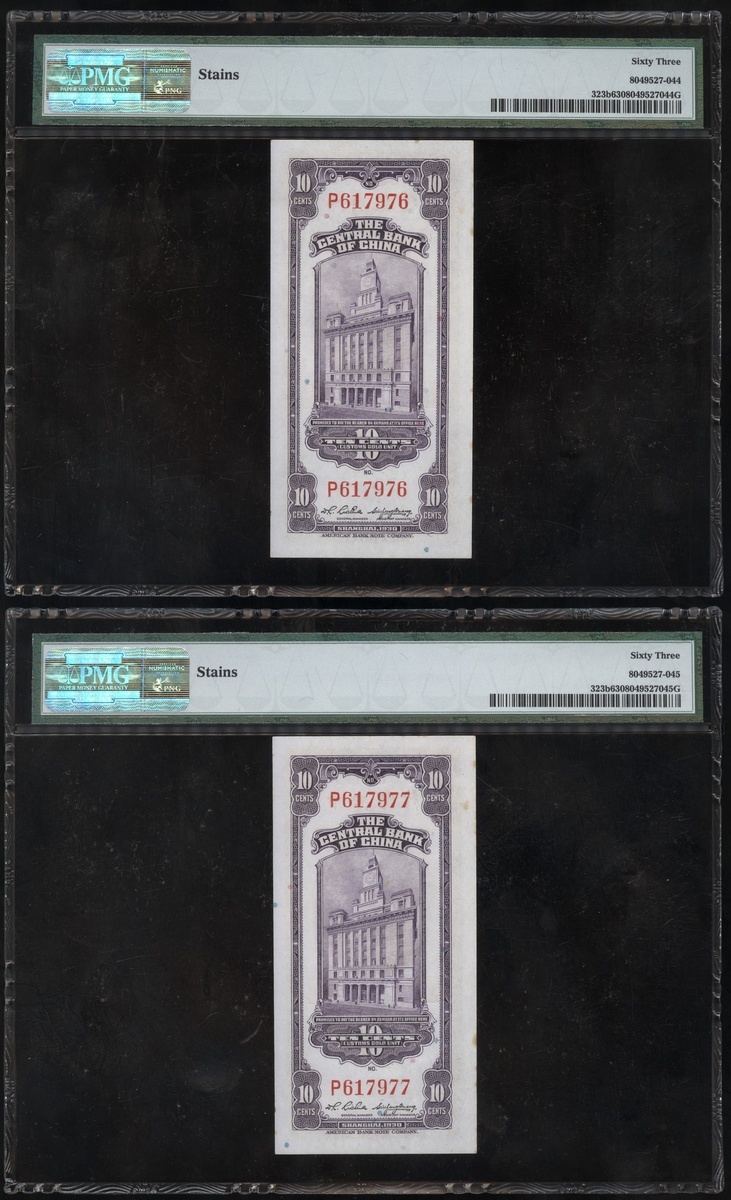 民國十九年中央銀行關金拾分兩枚連號枚,上海地名,編號P617976-P617977,均PMG 63