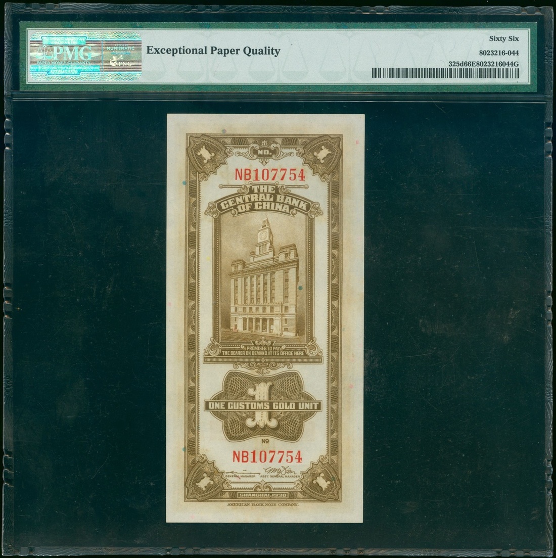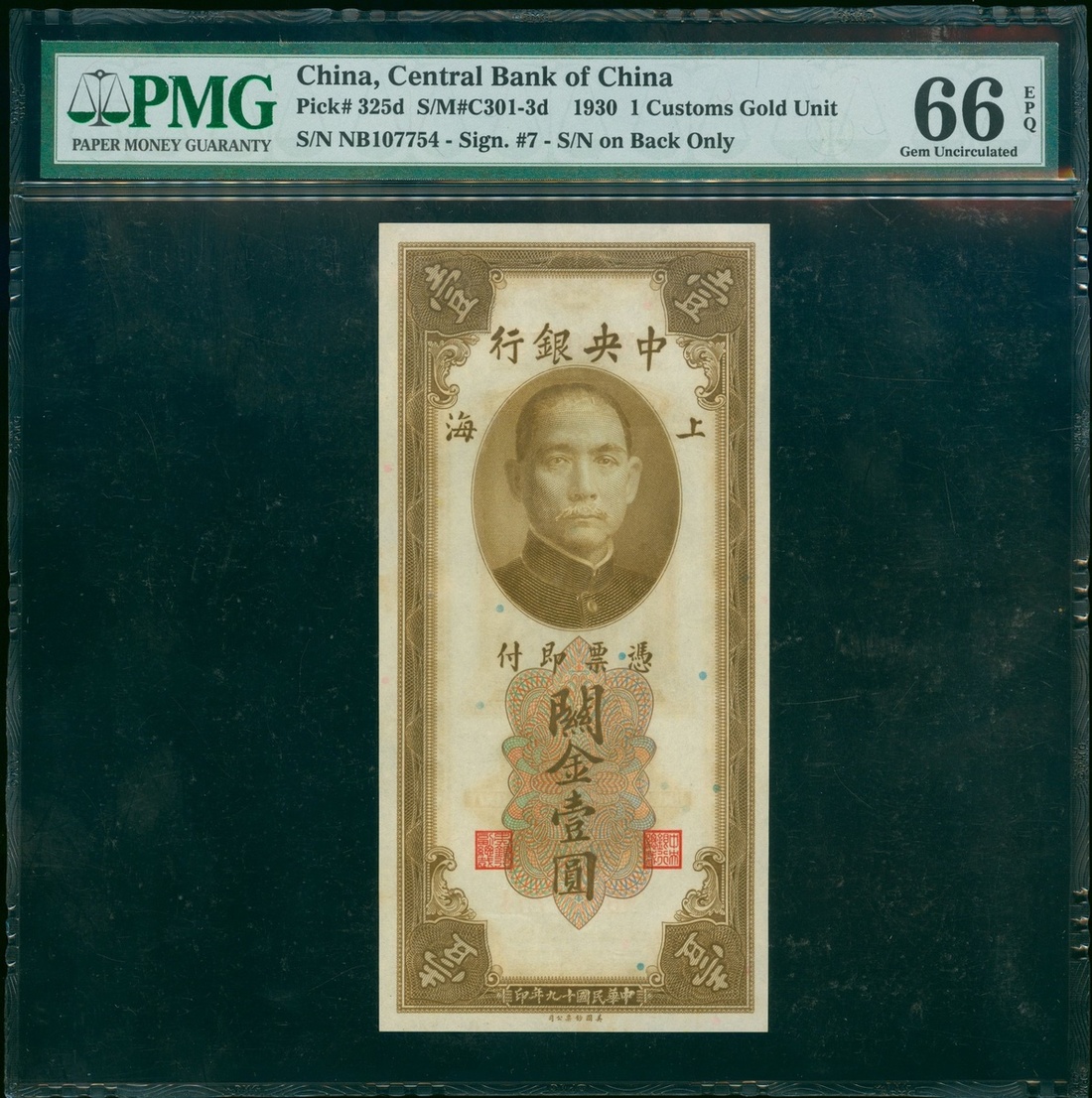 Central Bank of China, 1 Customs Gold Unit, Shanghai, Year 19(1930), serial number on back NB107754, (Pick 325d), PMG 66EPQ Gem Uncirculated