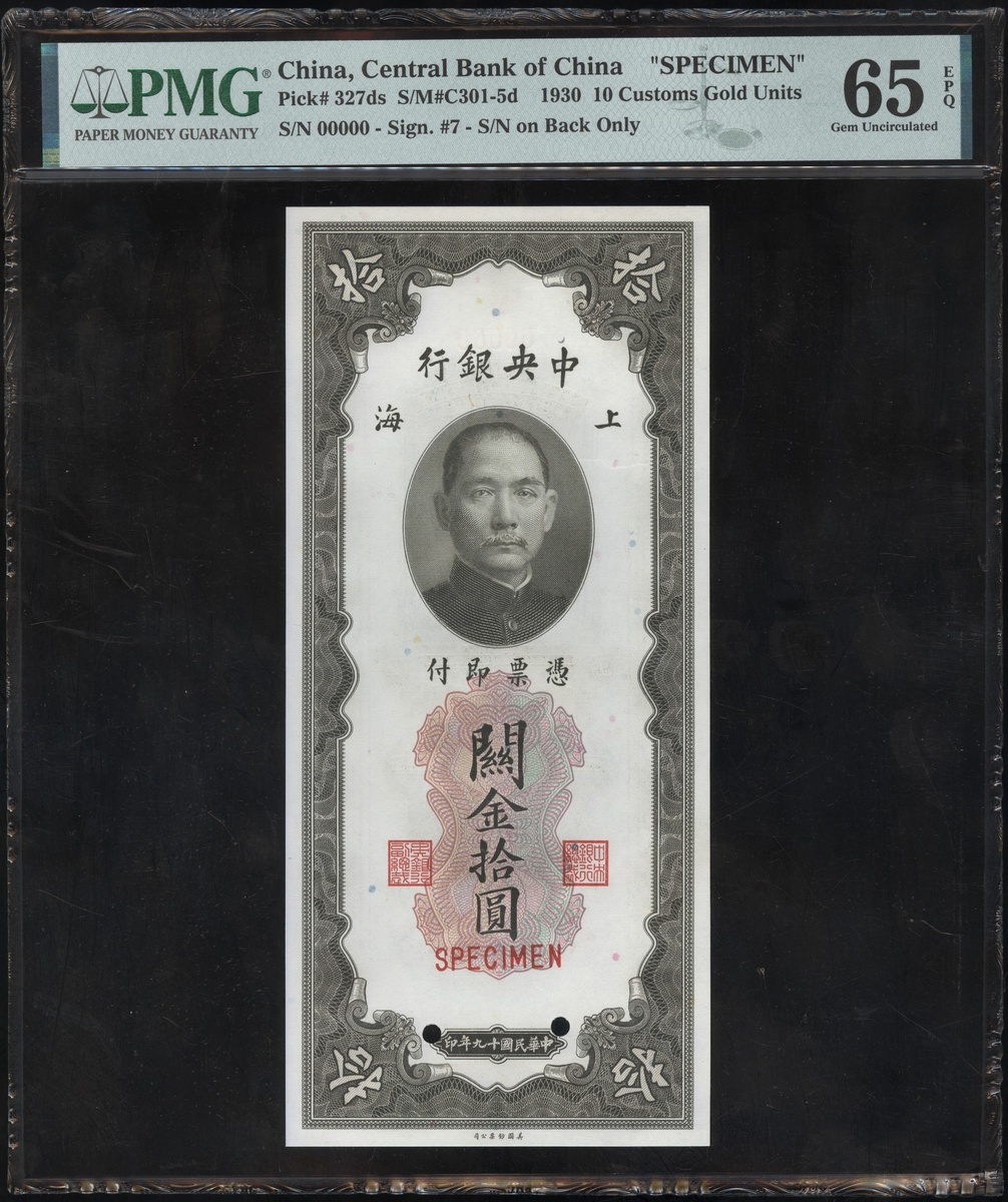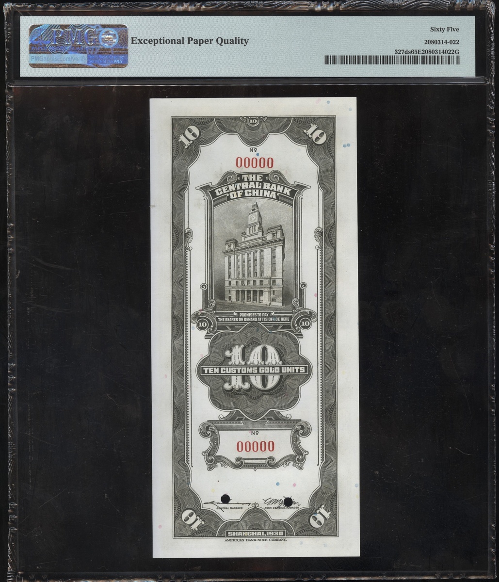 民國十九年中央銀行關金拾圓樣票,上海地名,編號00000,PMG 65EPQ