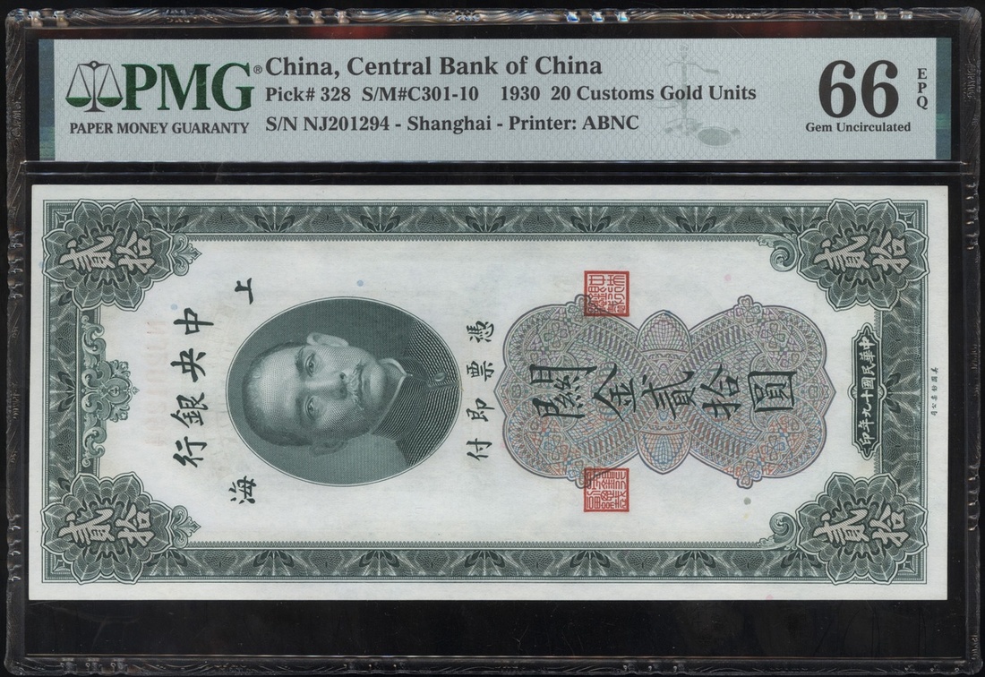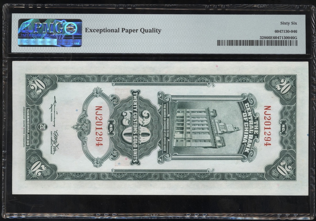 民國十九年中央銀行關金貳拾圓,上海地名,編號NJ201294,PMG 66EPQ