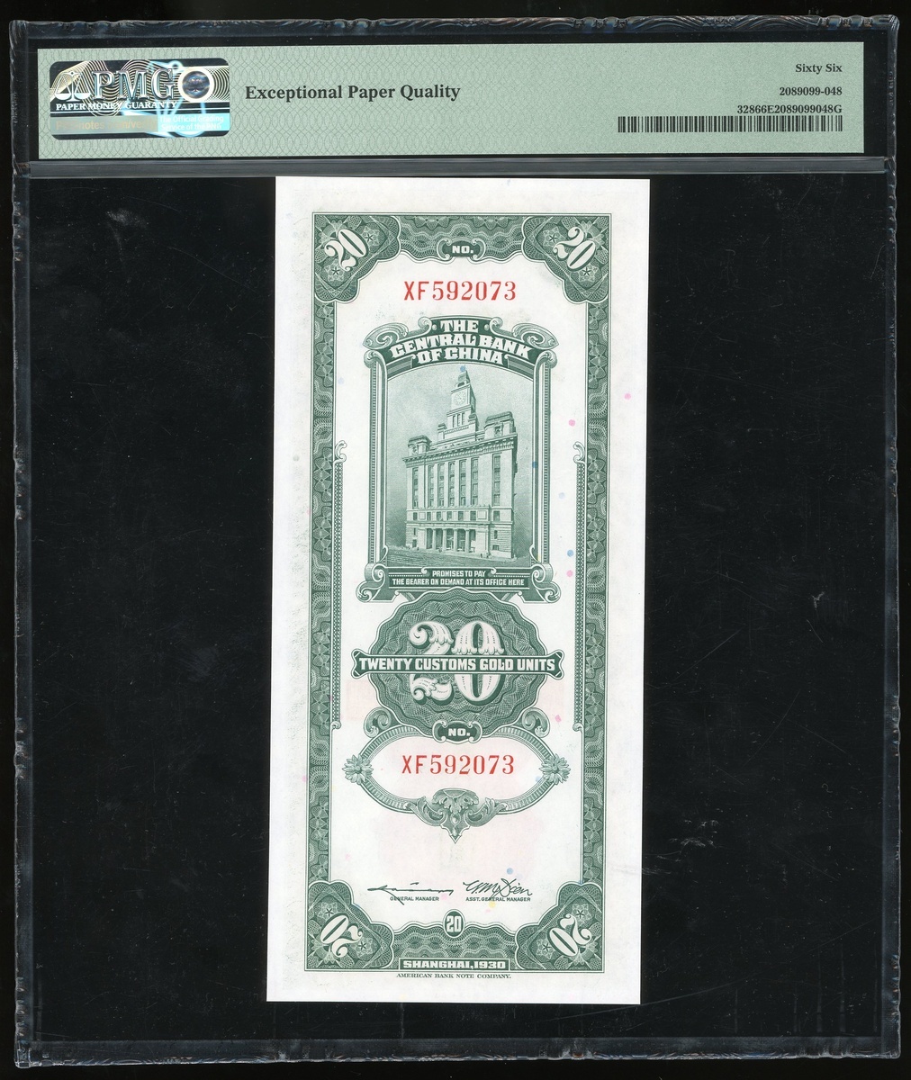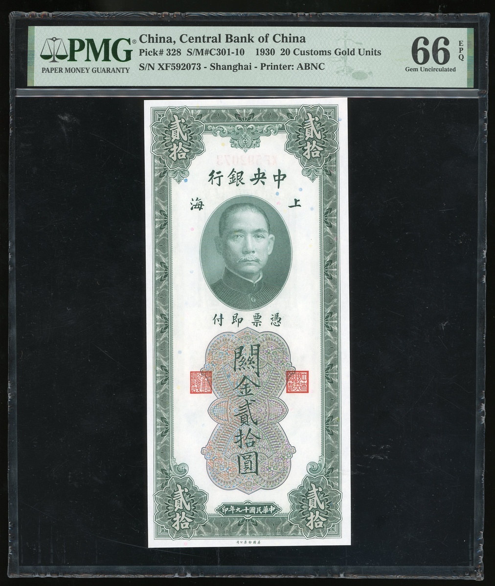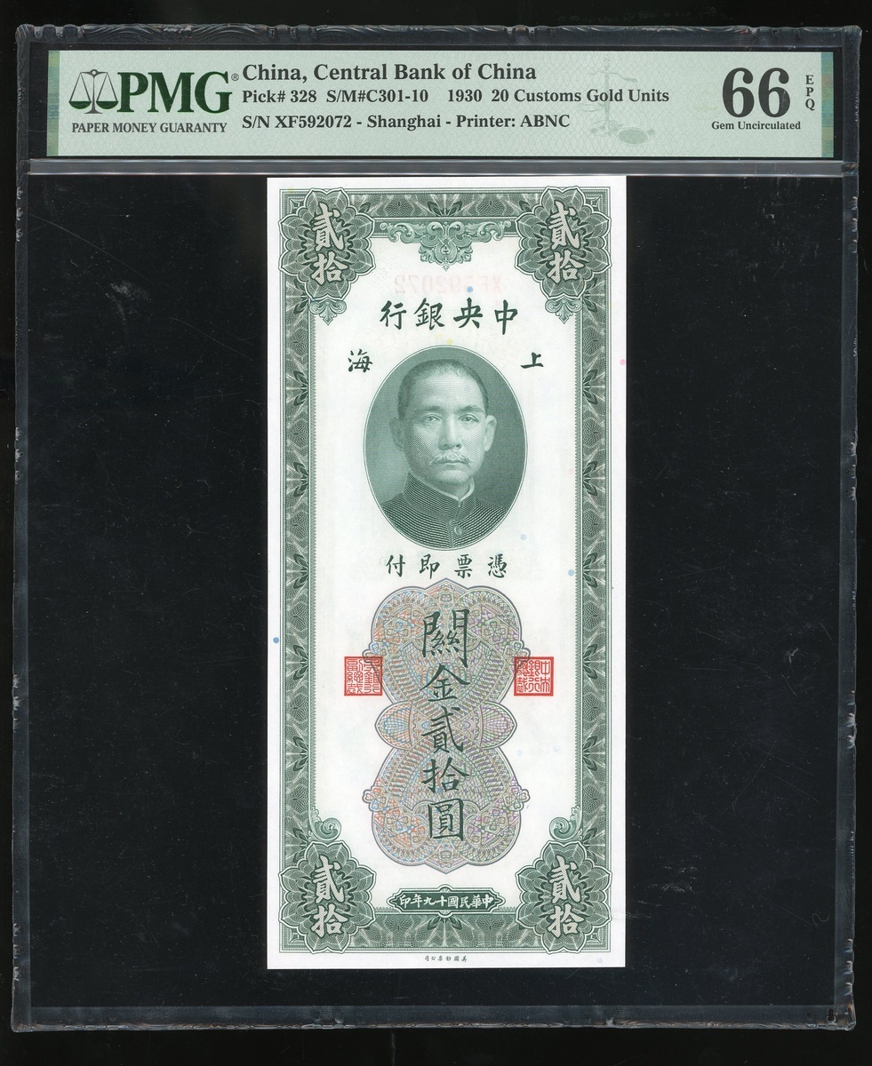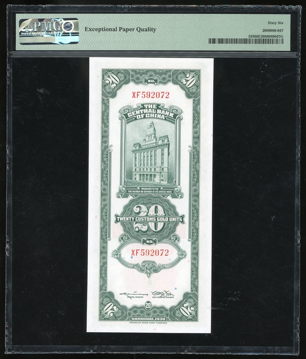 民國十九年(1930)中央銀行關金券貳拾圓,上海地名,編號XF592072-3,均評PMG 66EPQ