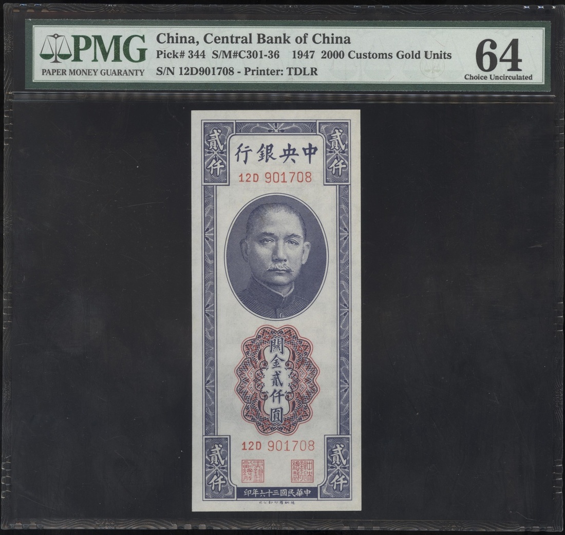民國三十七年中央銀行關金貳仟圓,編號12D901708,PMG 64
