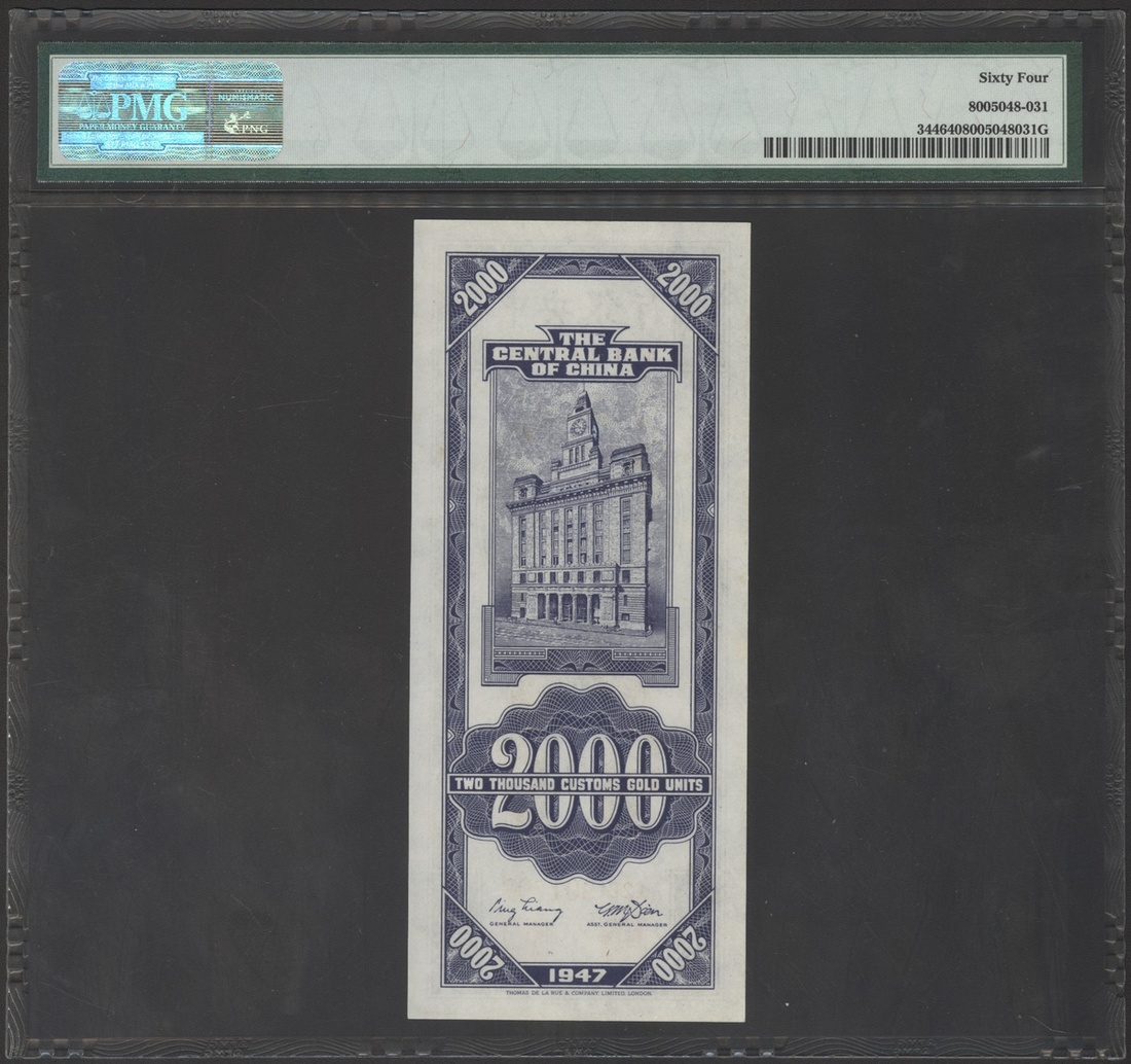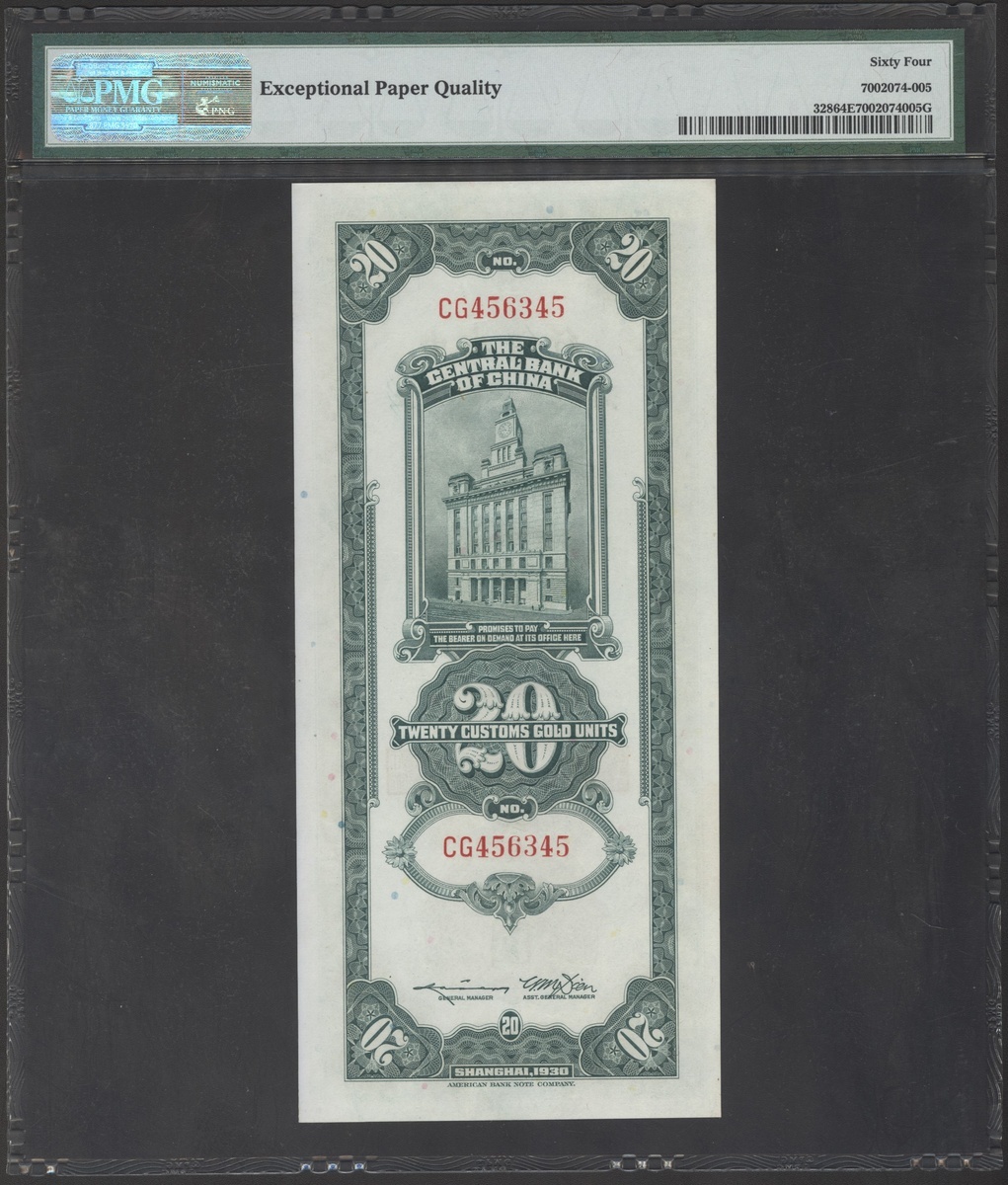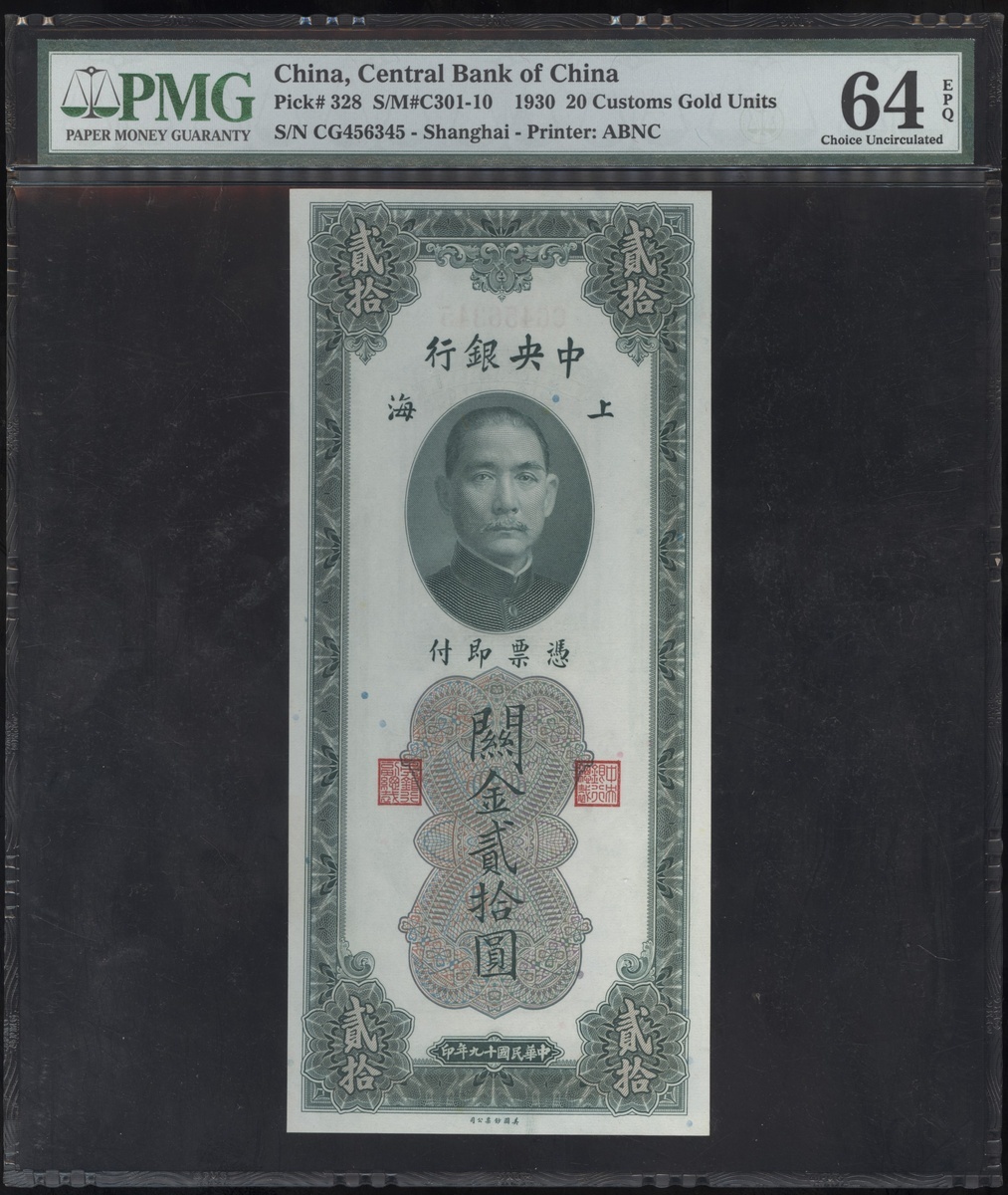 Central Bank of China, a pair of 20 and 2000 Customs Gold Units, 1930 and 1947, serial number CG456345 and 12D901708, (Pick 328 and 344), both graded PMG 64 Choice Uncirculated (2)