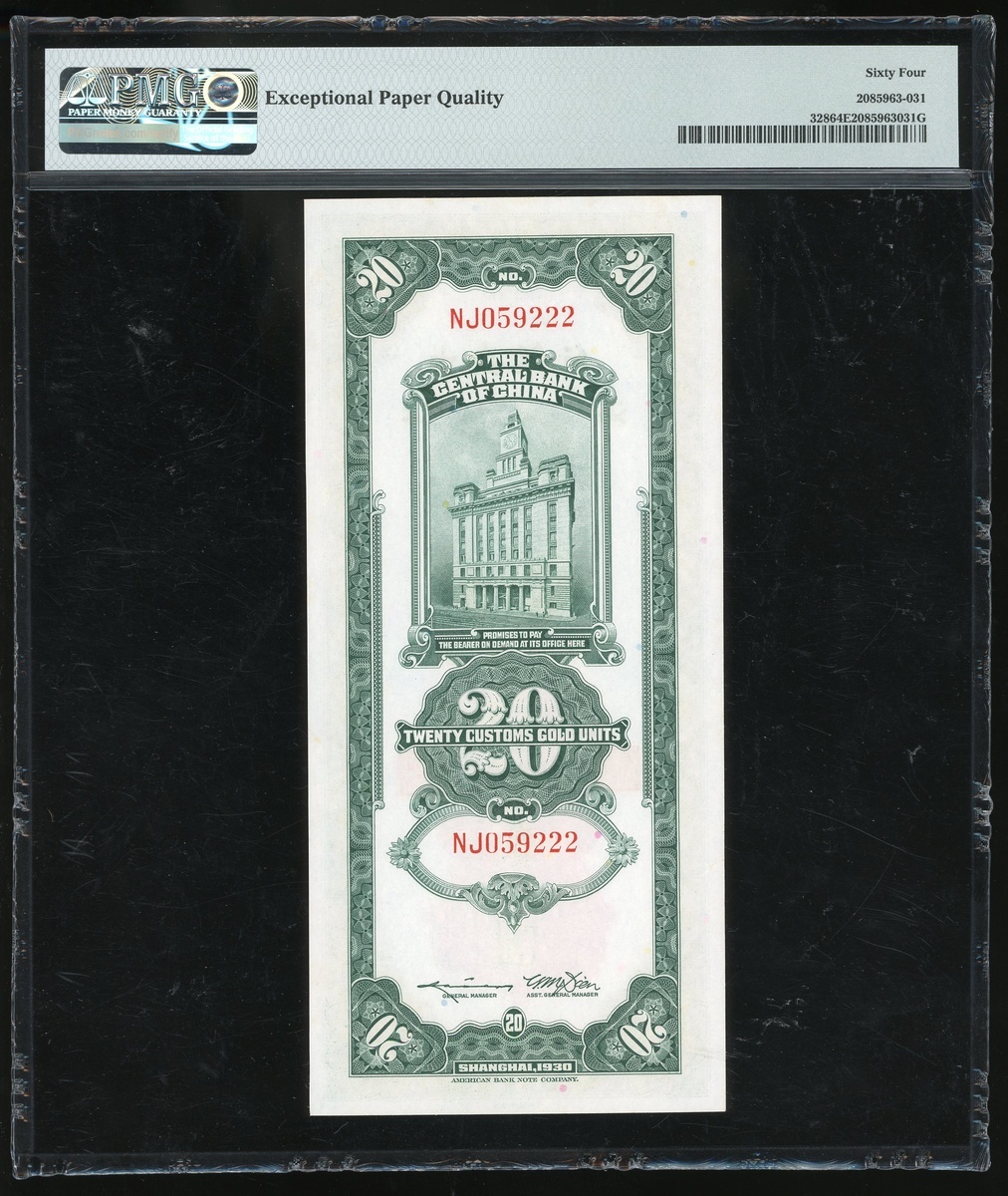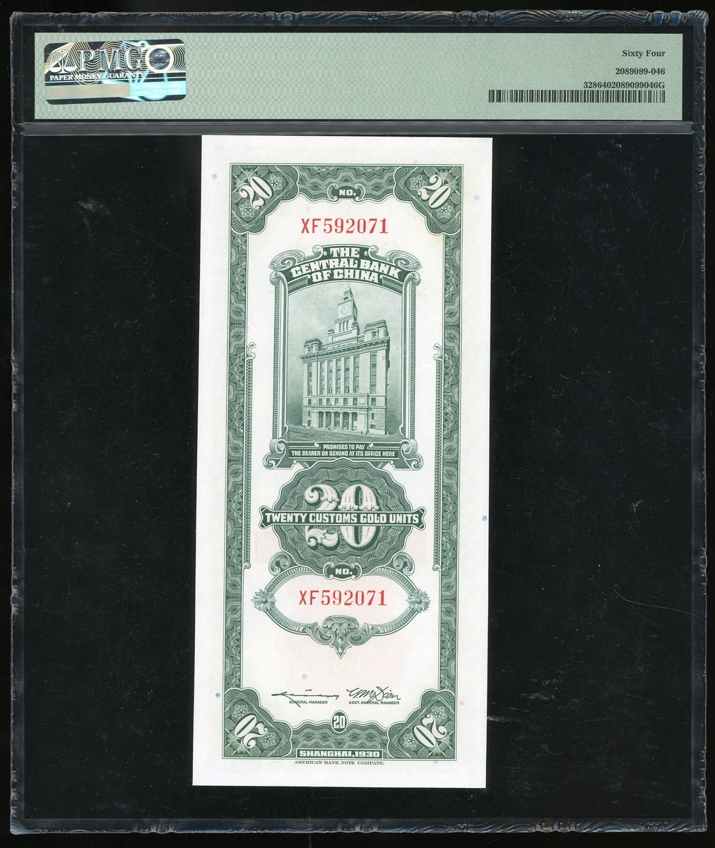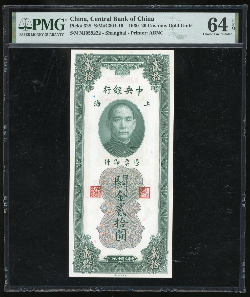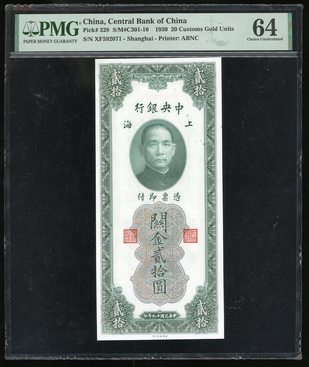 民國十九年(1930)中央銀行關金券貳拾圓,上海地名,編號NJ059222及XF592071,分別PMG 64,64EPQ