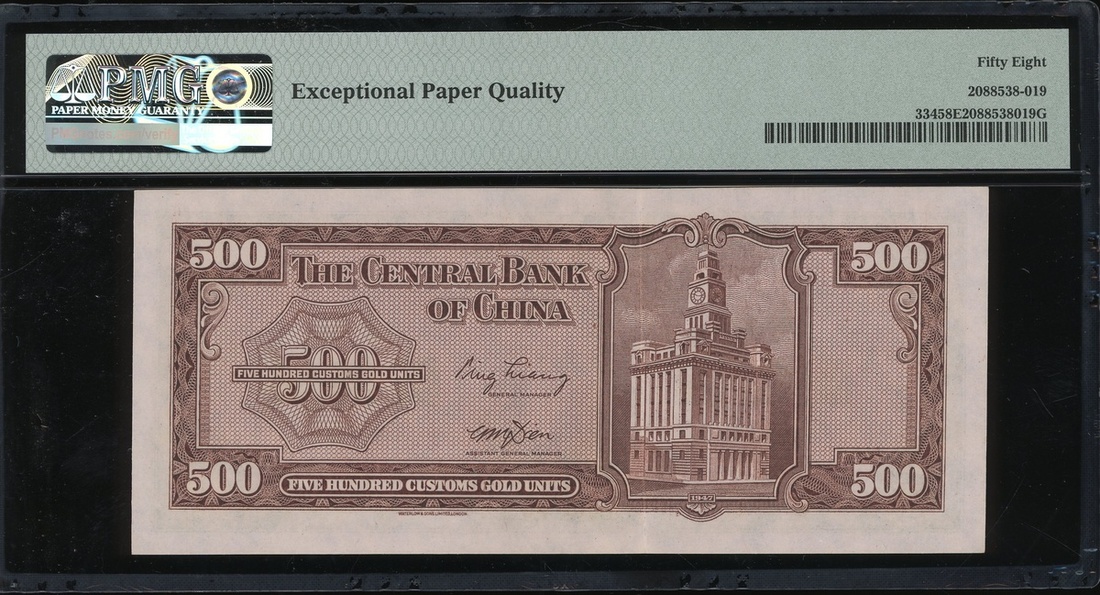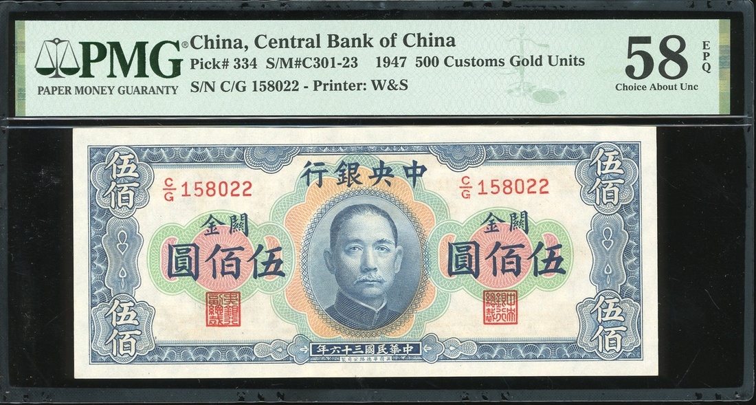 The Central Bank of China, 500 yuan Customs Gold Units, Year 36 (1947), serial number C/G 158022, (Pick 334), PMG 58EPQ Choice About Uncirculated