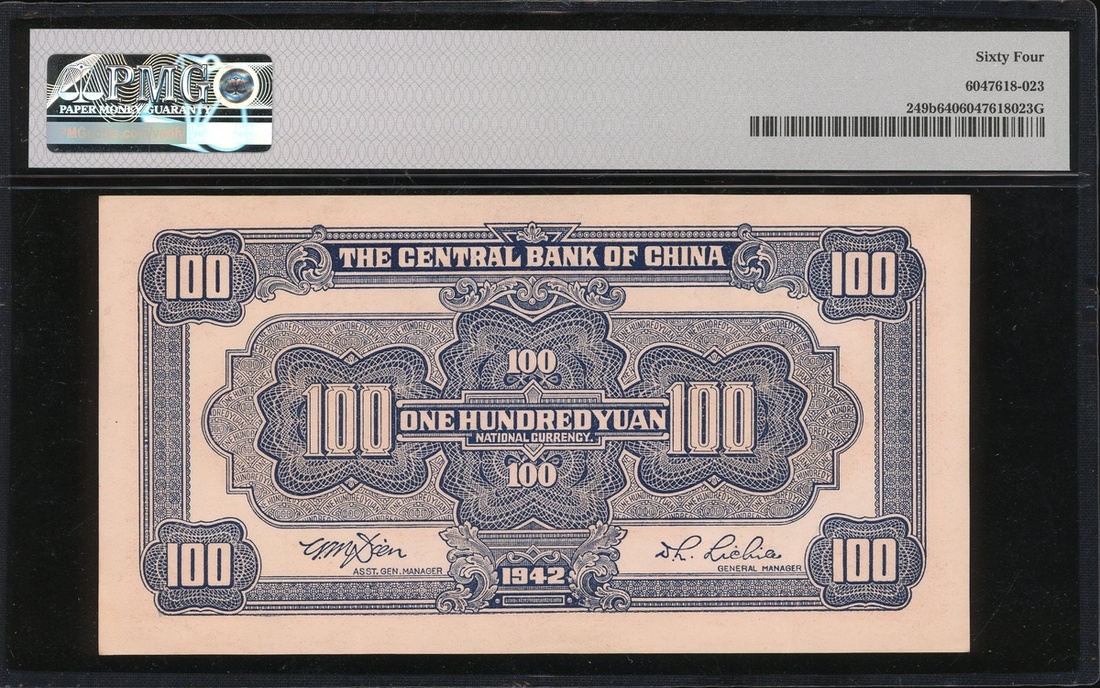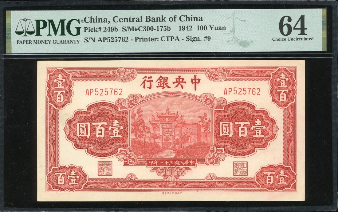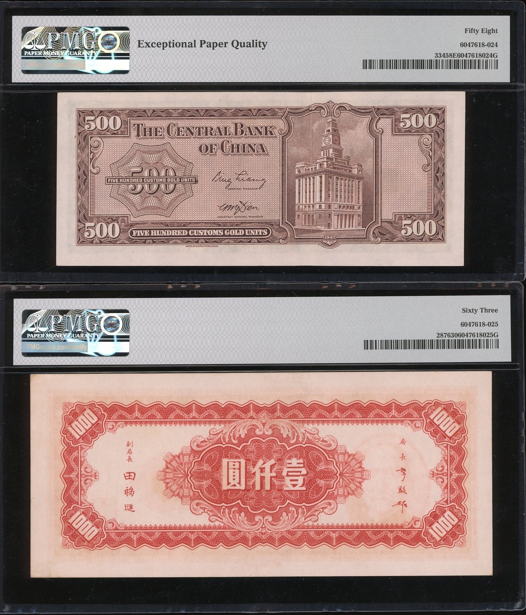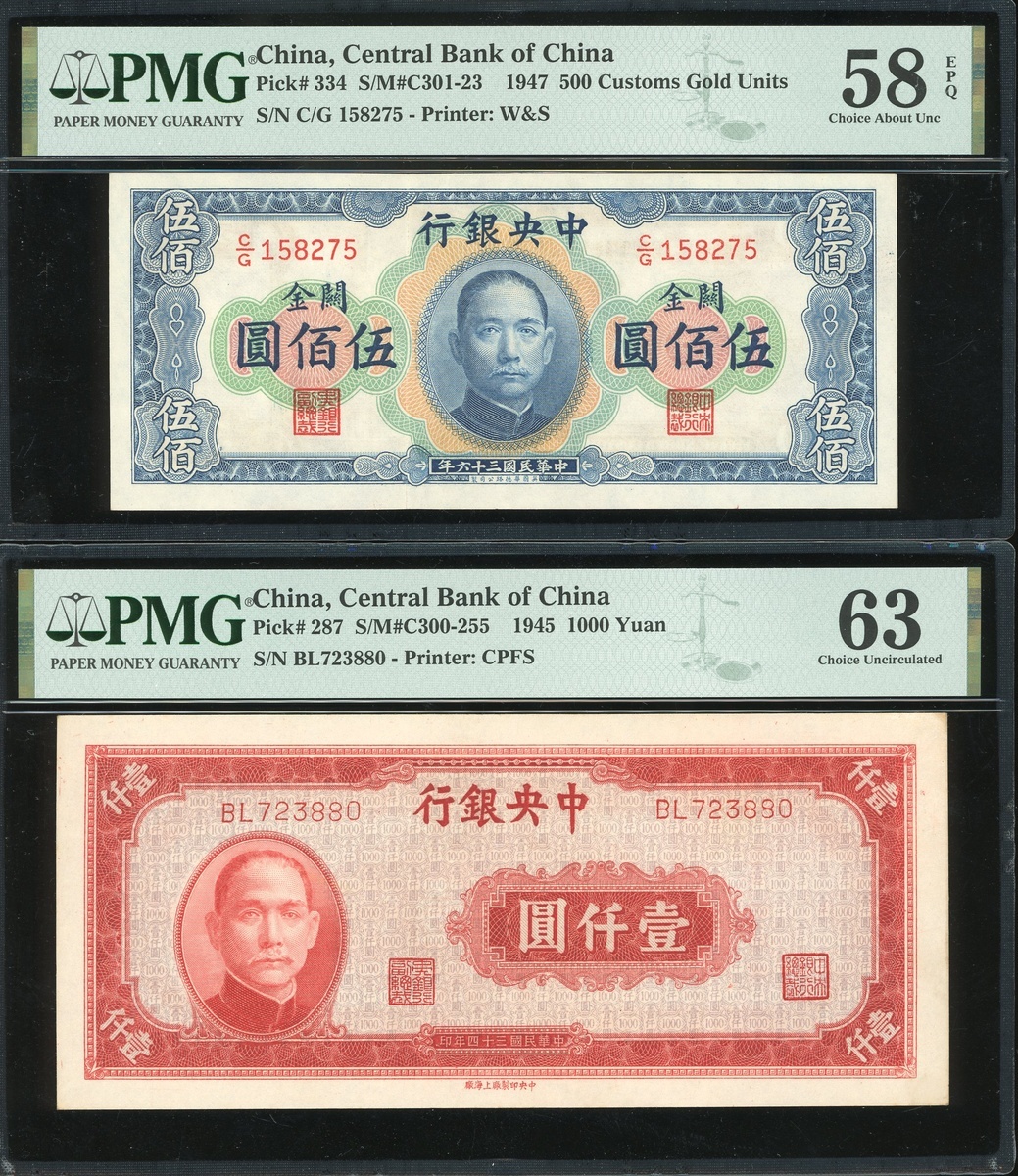 Cetnral Bank of China, a group of 3 notes, consists of 100 yuan, 1942, 1000 yuan, 1945 and 500 customes gold units, 1947, serial numbers AP525762, BL723880 and C/G 158275, (Pick 249b, 287 and 334), graded PMG 64, 63 and 58EPQ respectively (3).