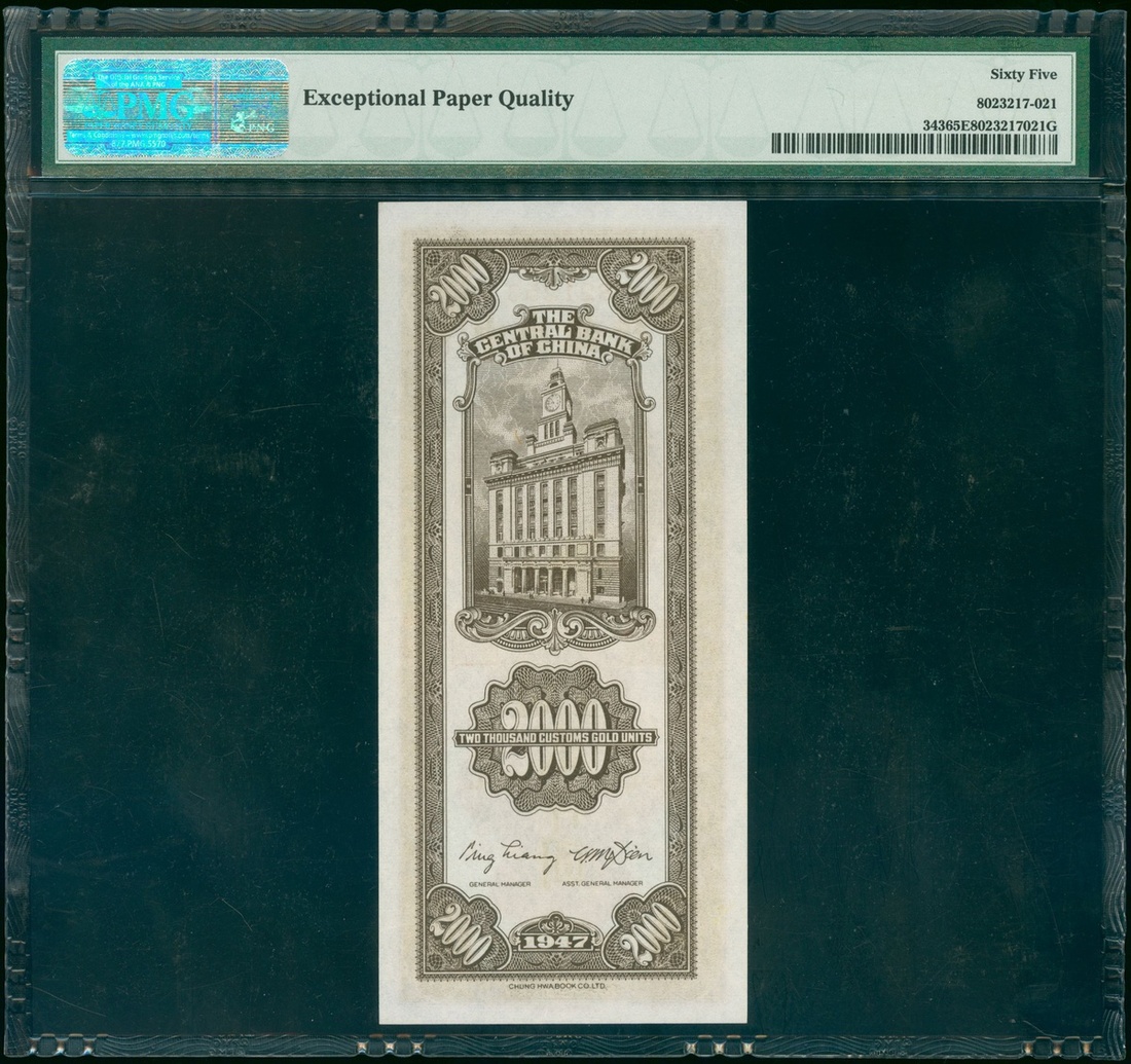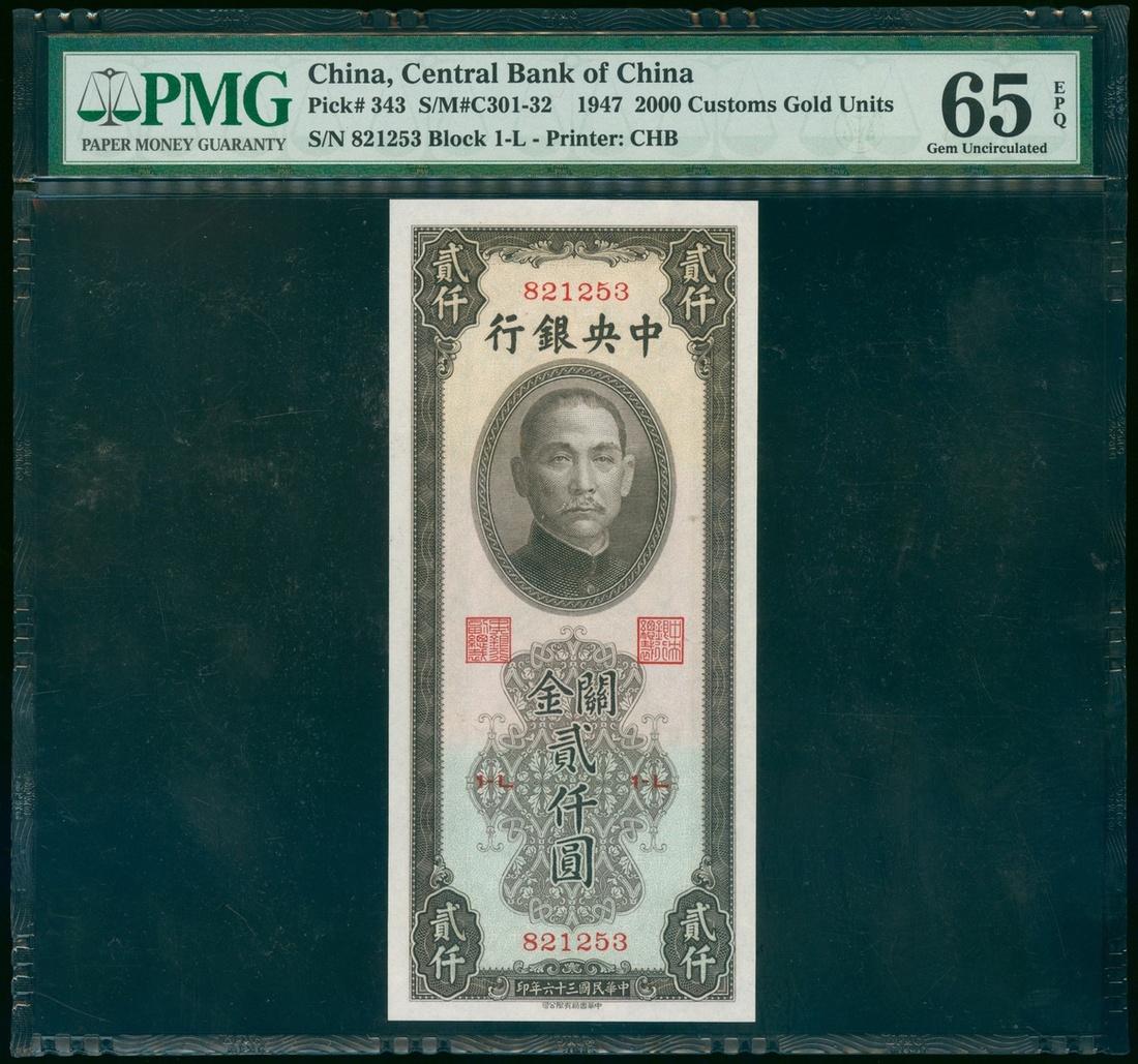 民國三十六年(1947)中央銀行關金券貳仟圓,編號821253,中華書局印製,評PMG 65EPQ