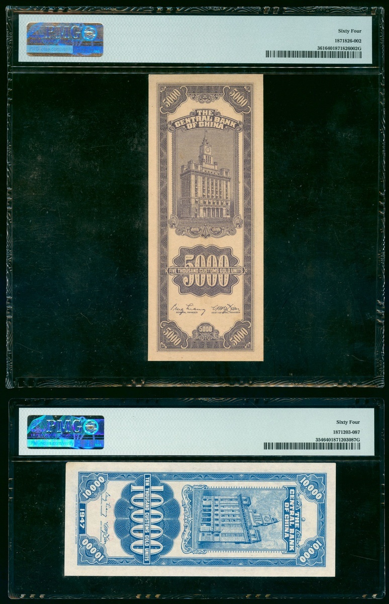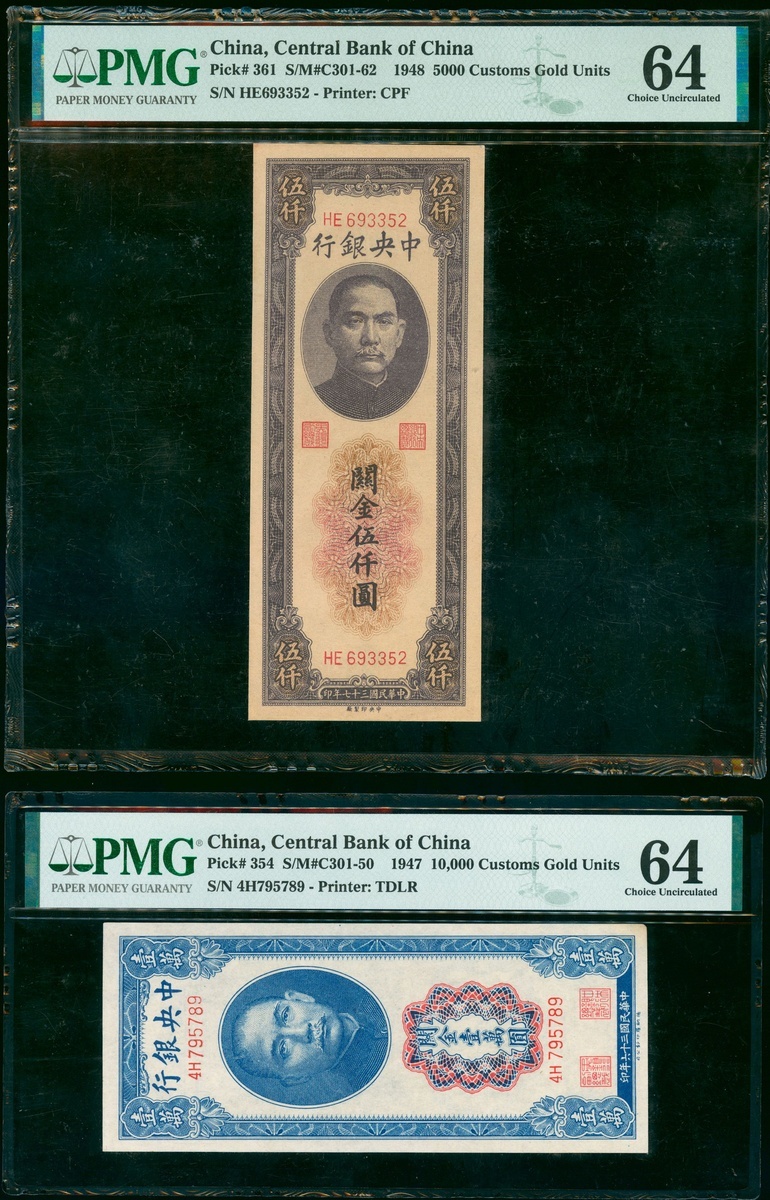 Central Bank of China, group of 2 notes: 10000 yuan Customs Gold Unit, 1947, 5000 yuan Customs Gold Unit, 1948, serial number 4H 795789, HE 693352, (Pick 354, 361), both graded PMG 64 Choice Uncirculated (2).