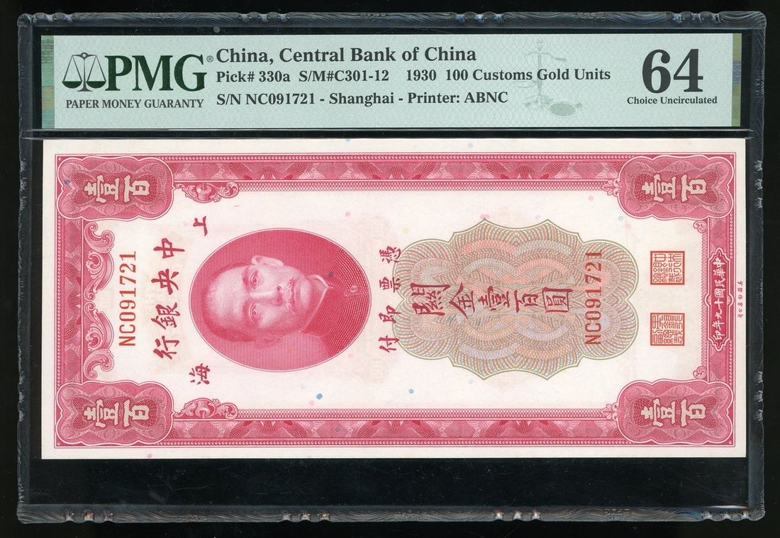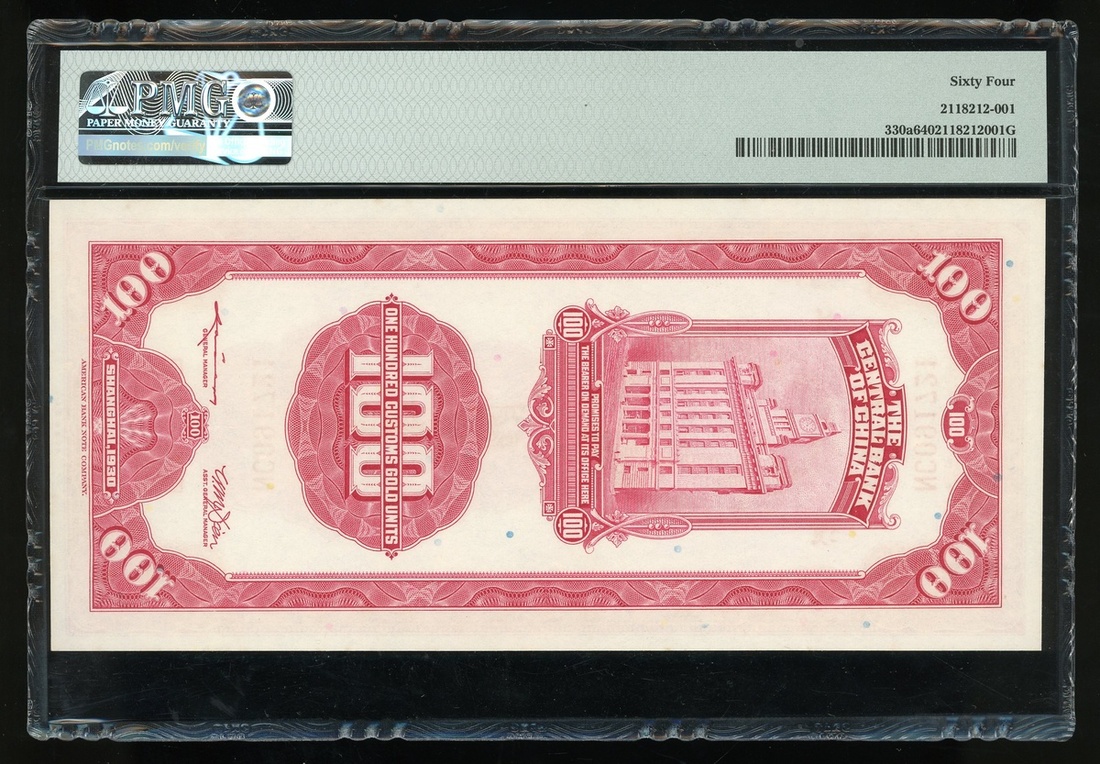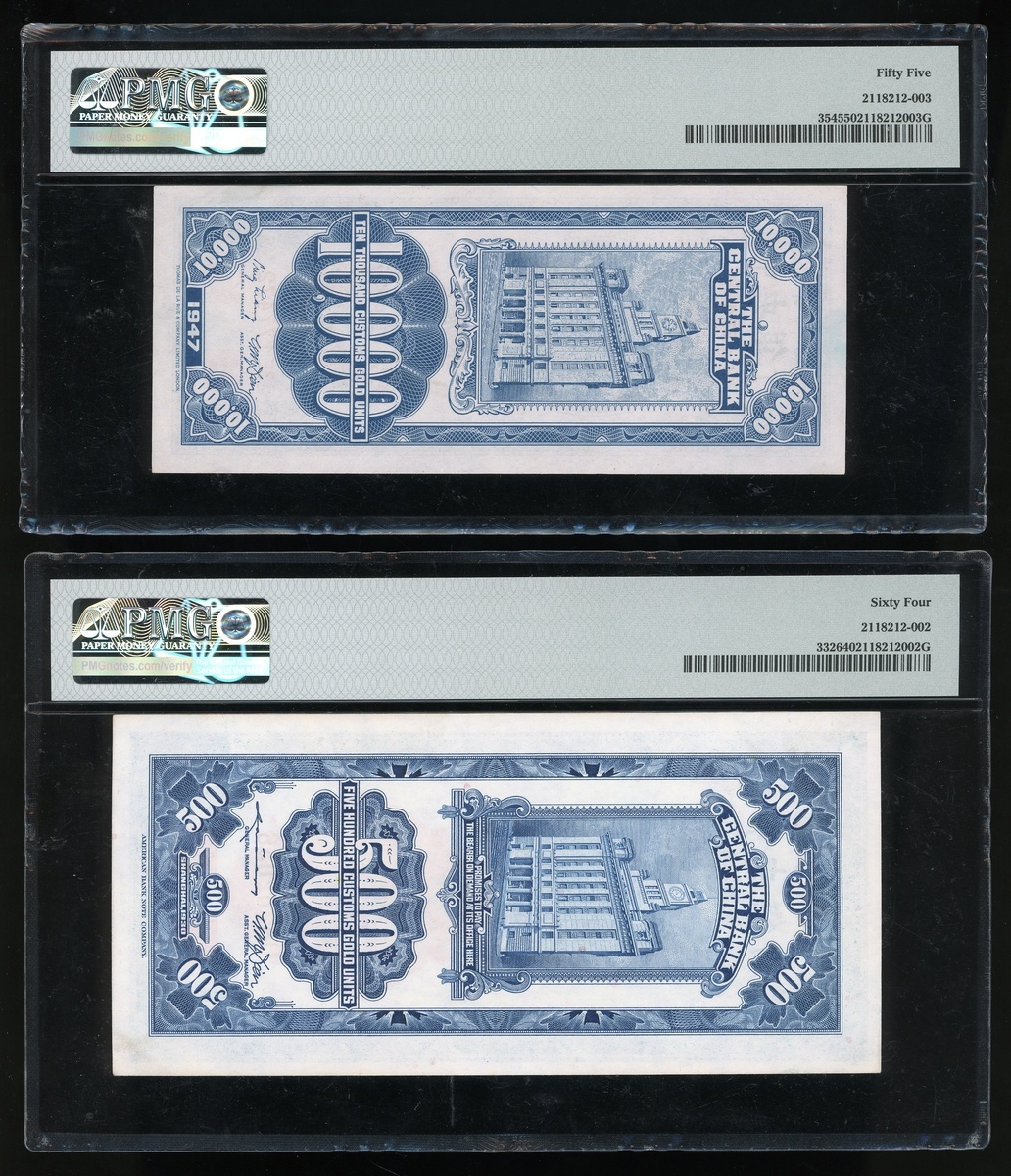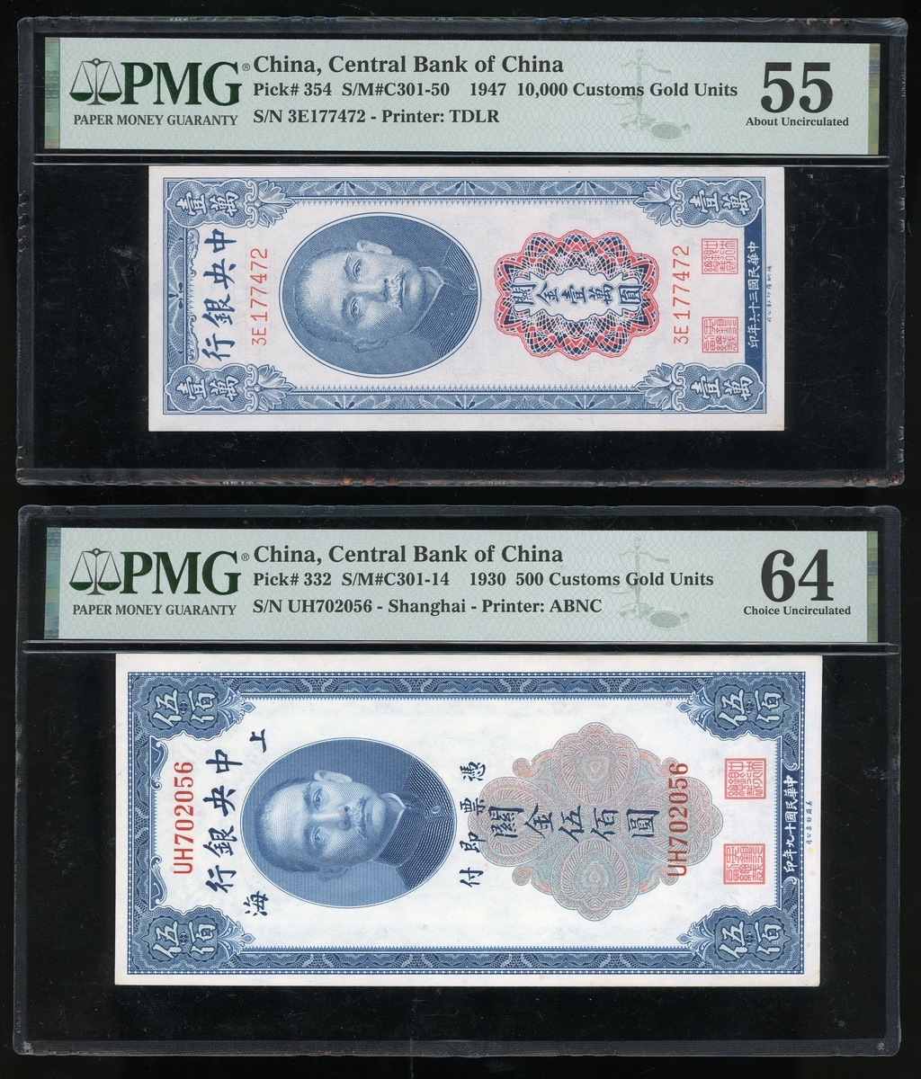 The Central Bank of China, group of 3 Custom Gold Units, 1x 10000 yuan, Year 36 (1947), serial number 3E177472, 1x 500 yuan, Year 19 (1930), serial number UH702056, 1x 100 yuan, Year 19 (1930), serial number NC091721, (Pick 354, 332 and 330a), graded PMG 55 About Uncirculated, 64 Choice Uncirculated and 64 Choice Uncirculated respectively (3)