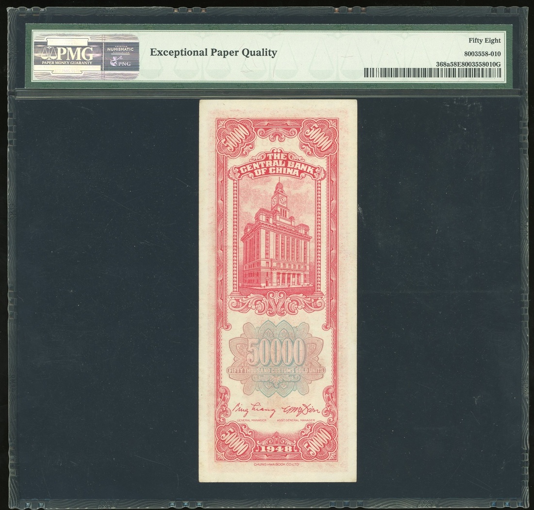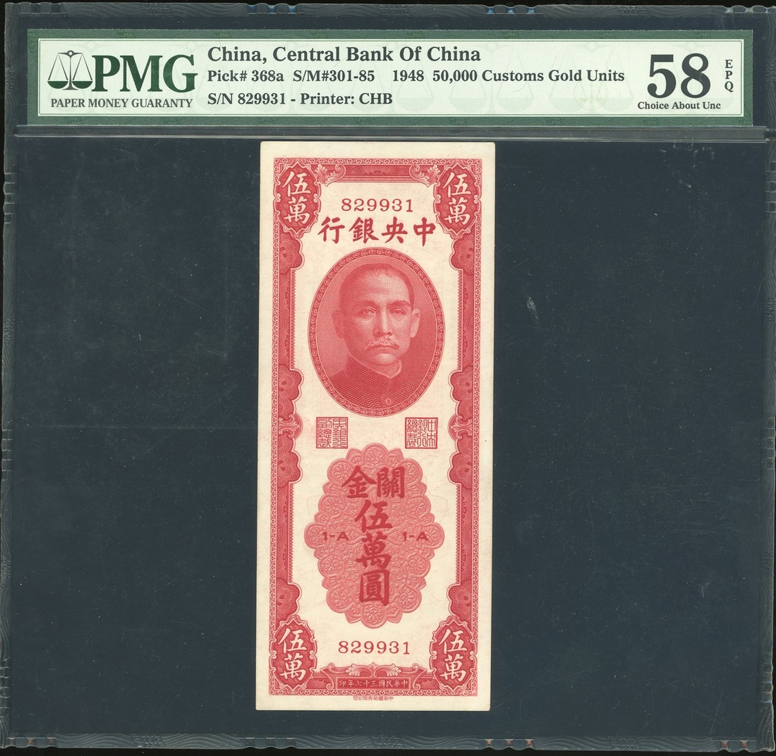 民國三十七年(1948)中央銀行關金券伍萬圓,編號829931,孫像置中,評PMG 58EPQ