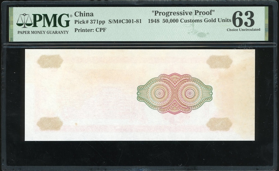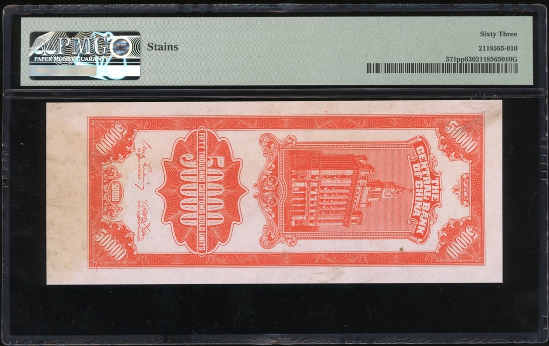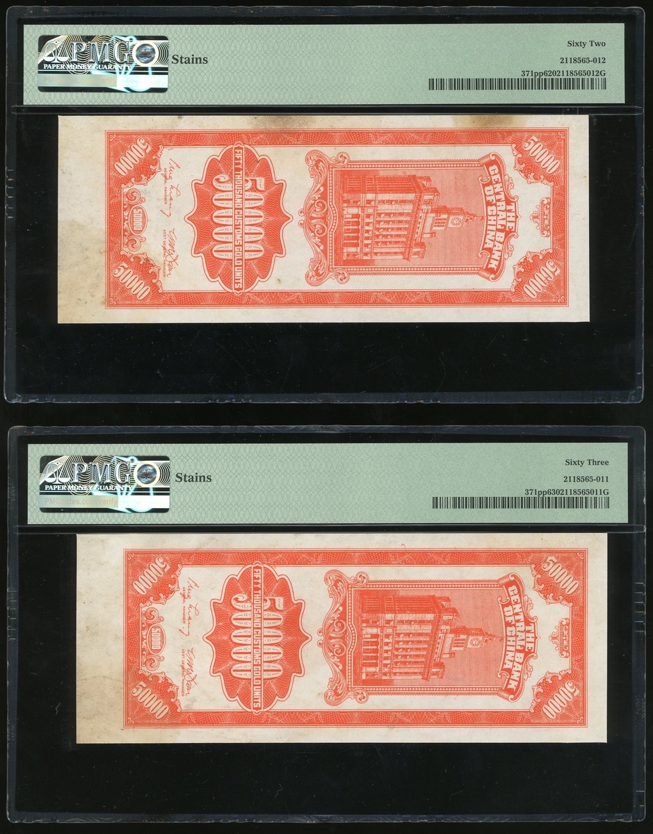 1948年中央銀行關金券伍萬圓試印樣票,一組3枚,無編號,印刷鮮明,細節栩栩如生,兩枚評PMG 63(有漬)及PMG 62(有漬)