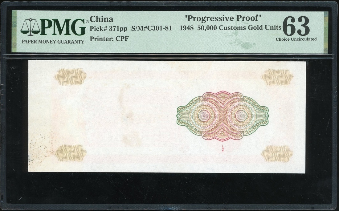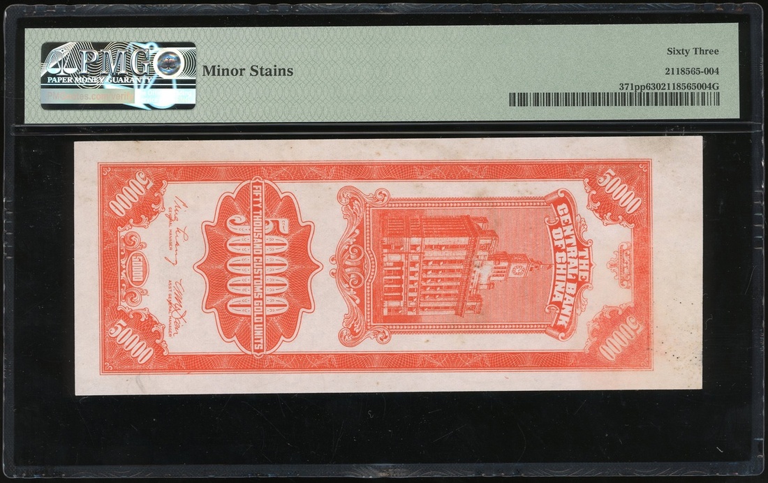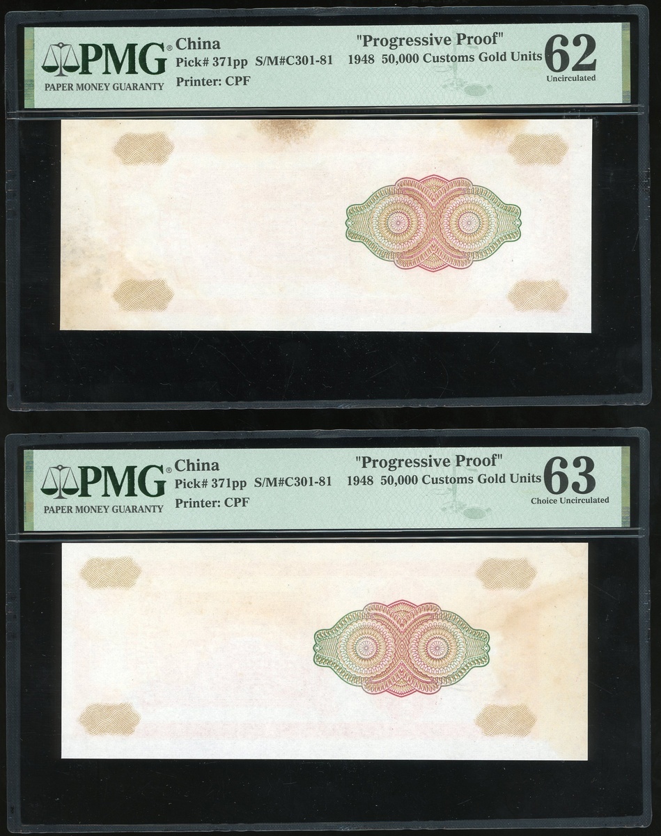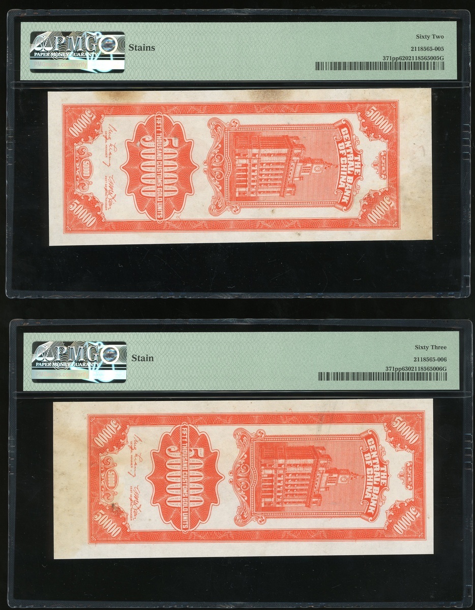 1948年中央銀行關金券伍萬圓試印樣票,一組3枚,無編號,印刷鮮明,細節栩栩如生,兩枚評PMG 63(有漬)及PMG 62(有漬)