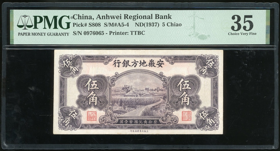 Anhwei Regional Bank, 5 chiao, ND (1937), serial number 0976065, (Pick S808), PMG 35 Choice Very Fine.