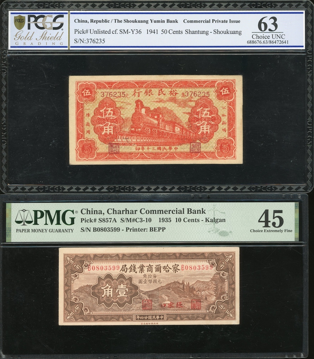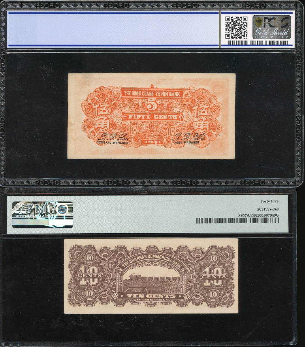 民國三十年壽光裕民銀行五角,編號376235 ,及察哈爾興業銀行一角,張家口地名,編號B0803599,分別PCGS Gold Shield 63及45