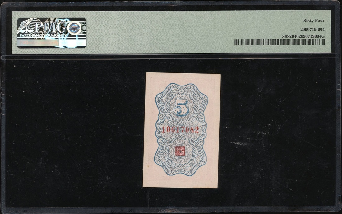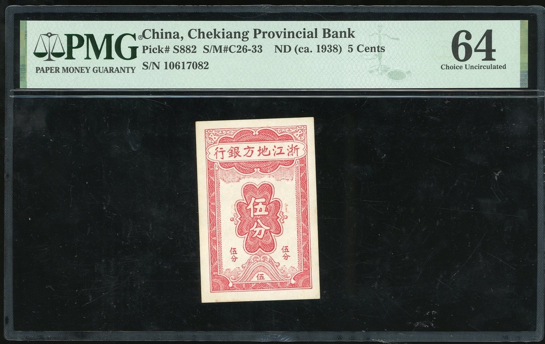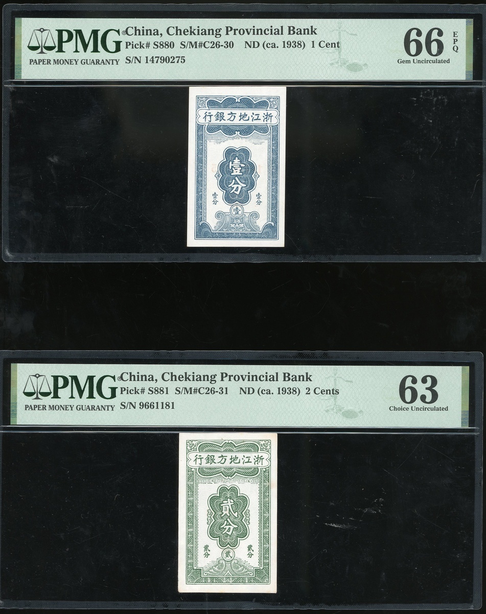 Chekiang Provincial Bank, a group of 3 notes, consists of 1 cent, 2 cents and 5 cents, ND (ca.1938), serial numbers 14790275, 9661181 and 10617082, (Pick S880, S881 and S882), graded PMG 66EPQ, 63 and 64 respectively (3).