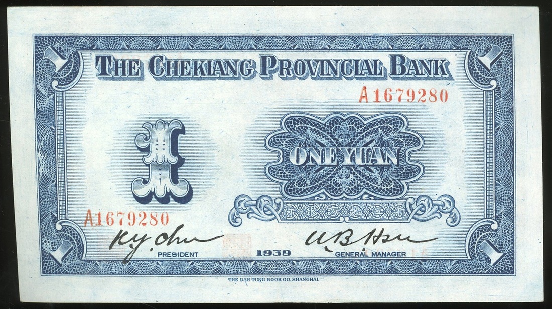 The Chekiang Provincial Bank, 1 yuan, Year 28(1939), serial number A1679280, (Pick S888), central fold, almost uncirculated