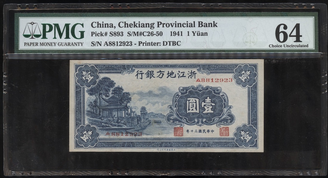 民國三十年浙江地方銀行壹圓,編號A8812923,PMG 64