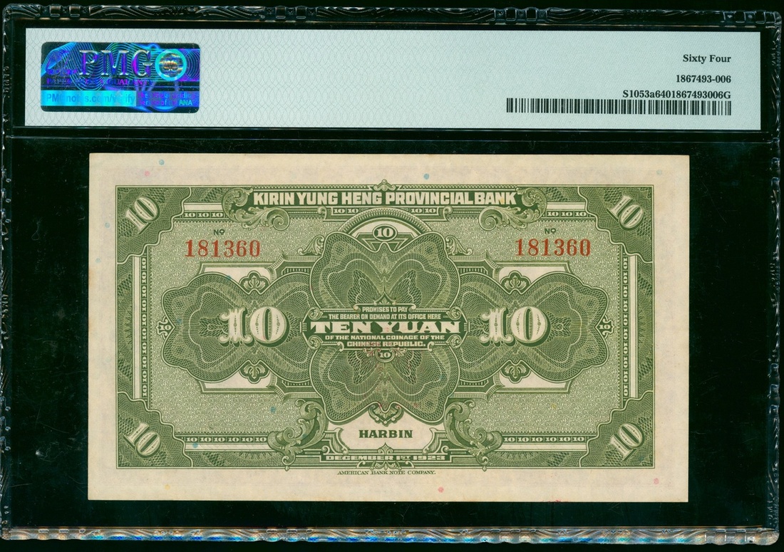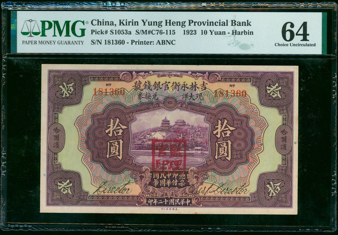 Kirin Yung Heng Provincial Bank, 10 Yuan, Harbin, Year 12 (1923), serial number 181360, (Pick S1053a), PMG 64 Choice Uncirculated.
