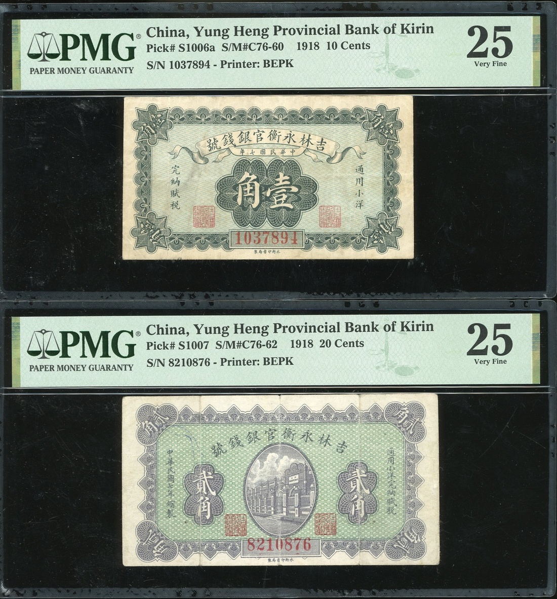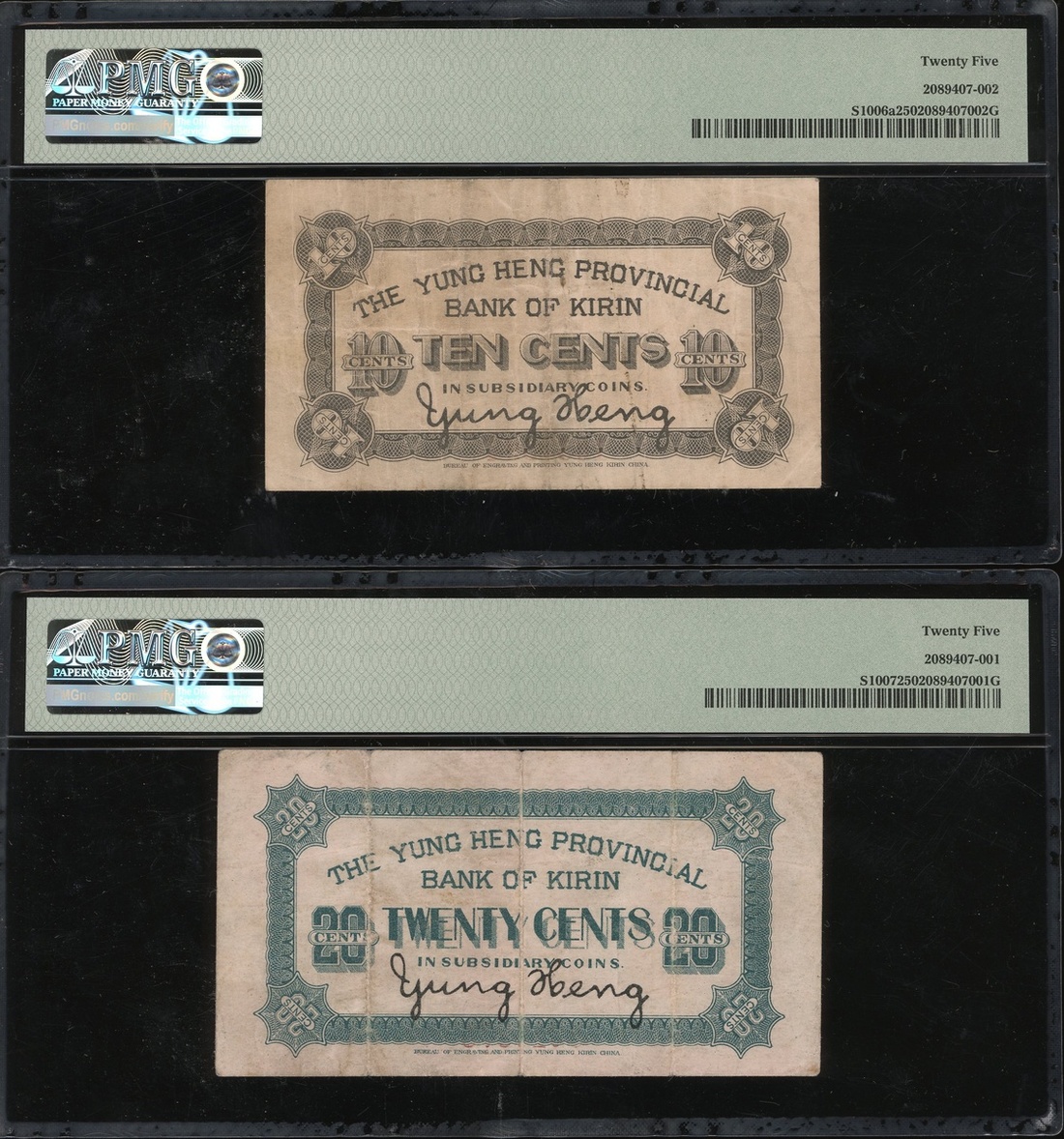 Yung Heng Provincial Bank of Kirin, 10 cents and 20 cents, Year 7 (1918), serial numbers 1037894, 8210876, (Pick S1006a, S1007), both graded PMG 25 Very Fine (2)