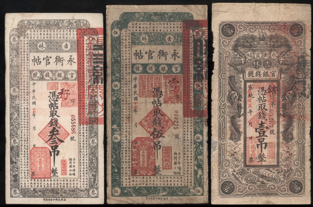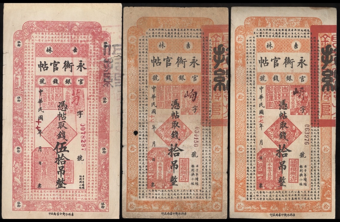 Kirin Yung Heng Provincial Bank, a group of 6 notes, 1, 3, 5, 10(2) and 50 tiao, 1928, serial numbers 09267, 040275, 055686, 034150, 063976 and 0078297, (Pick S981, S1077, S1079, S1080 and S1081), generally fine to extremely fine, viewing highly recommended (6)