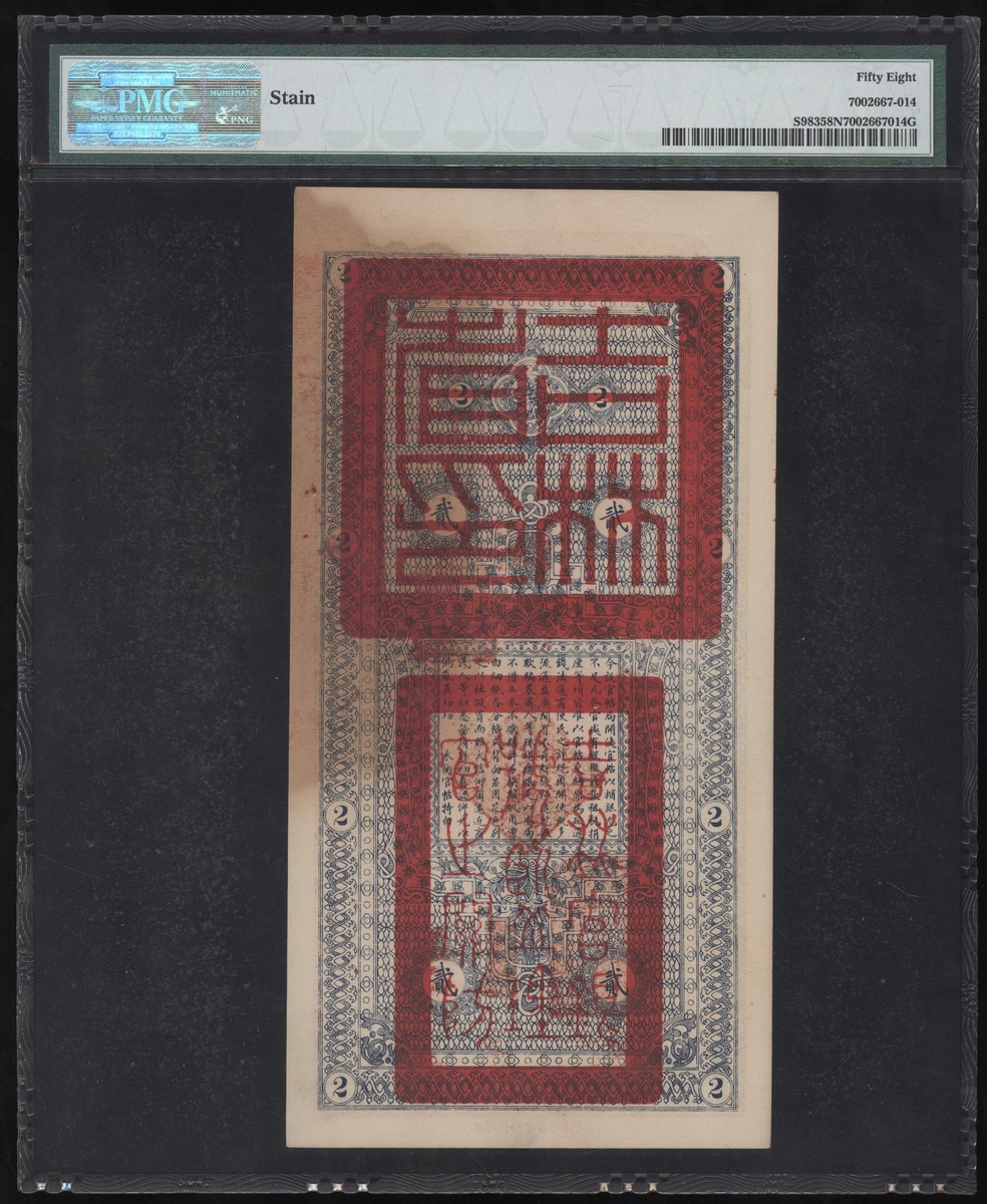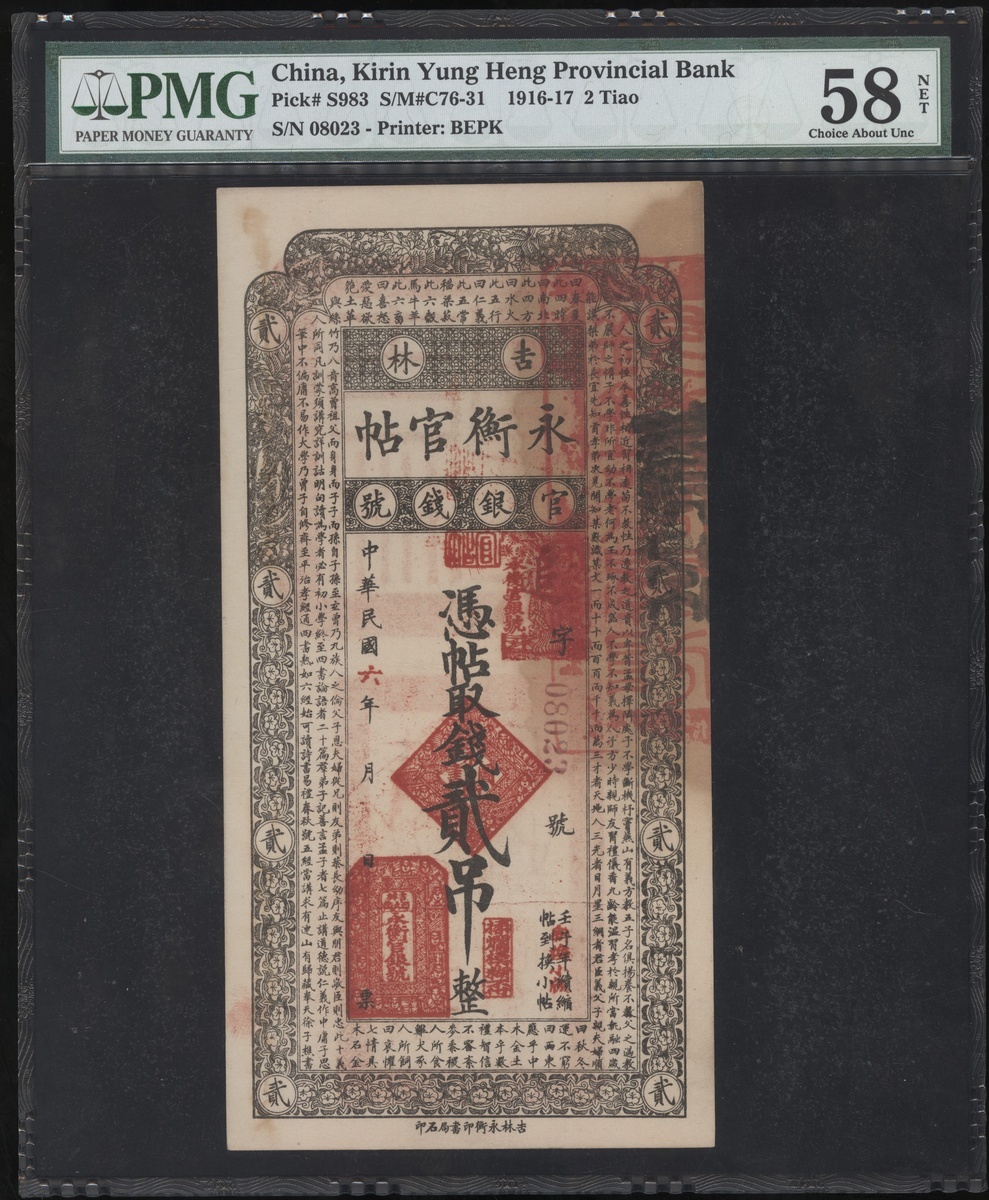 民國六年吉林永衡官帖官銀錢號貳吊,編號08023,有輕微污漬,PMG 58NET (有漬)