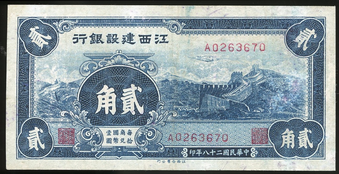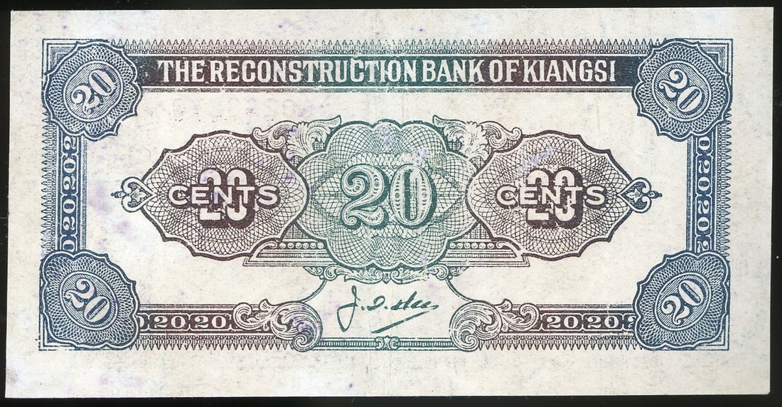 The Reconstruction Bank of Kiangsi, 20 cents, Year 28(1939), serial number A0263670, (Pick S1082F), pressed about very fine